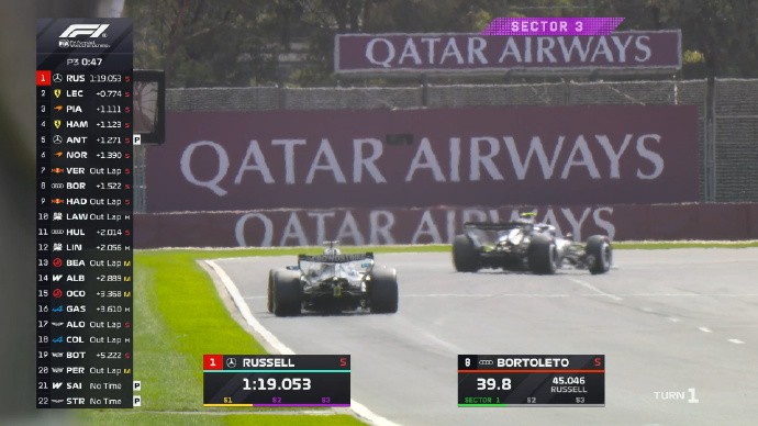 三练停表,拉塞尔在最后时刻大幅刷新最快成绩,他的成绩为1分19秒053。