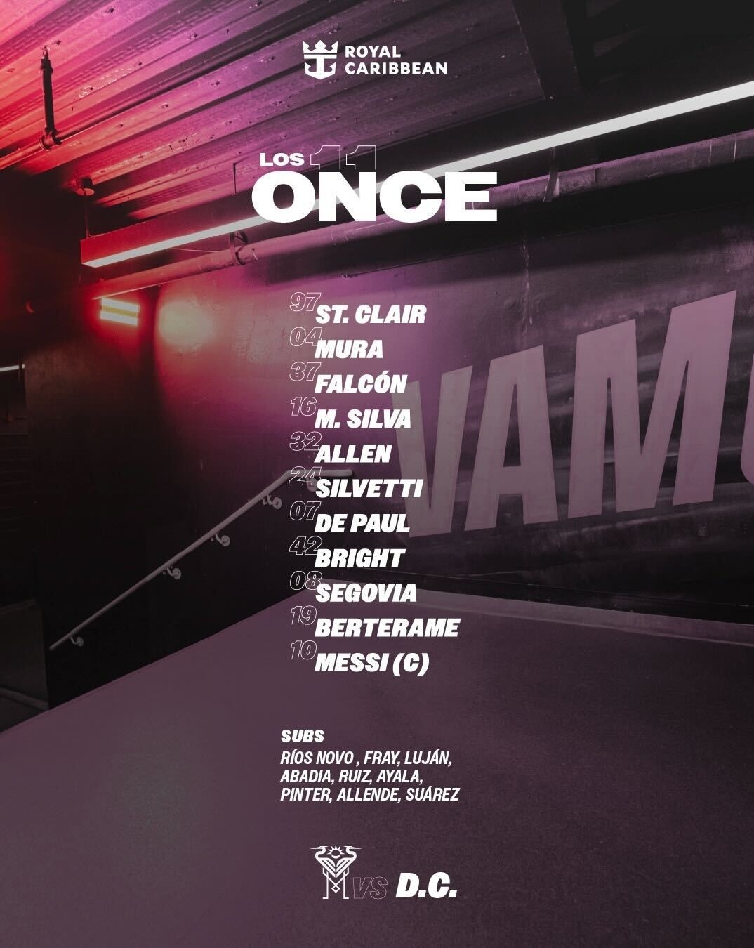 迈阿密国际首发:4-穆拉、7-德保罗、8-塞戈维亚、10-梅西、16-米卡埃尔、19-贝尔泰拉梅、24-马特奥-西尔维蒂、32-诺亚-艾伦、37-法尔孔、42-扬尼克-布赖特、97-圣克莱尔