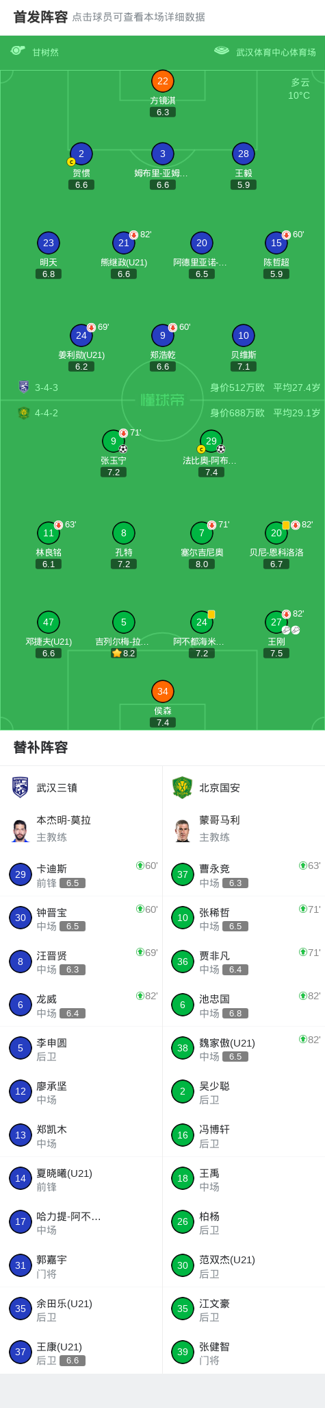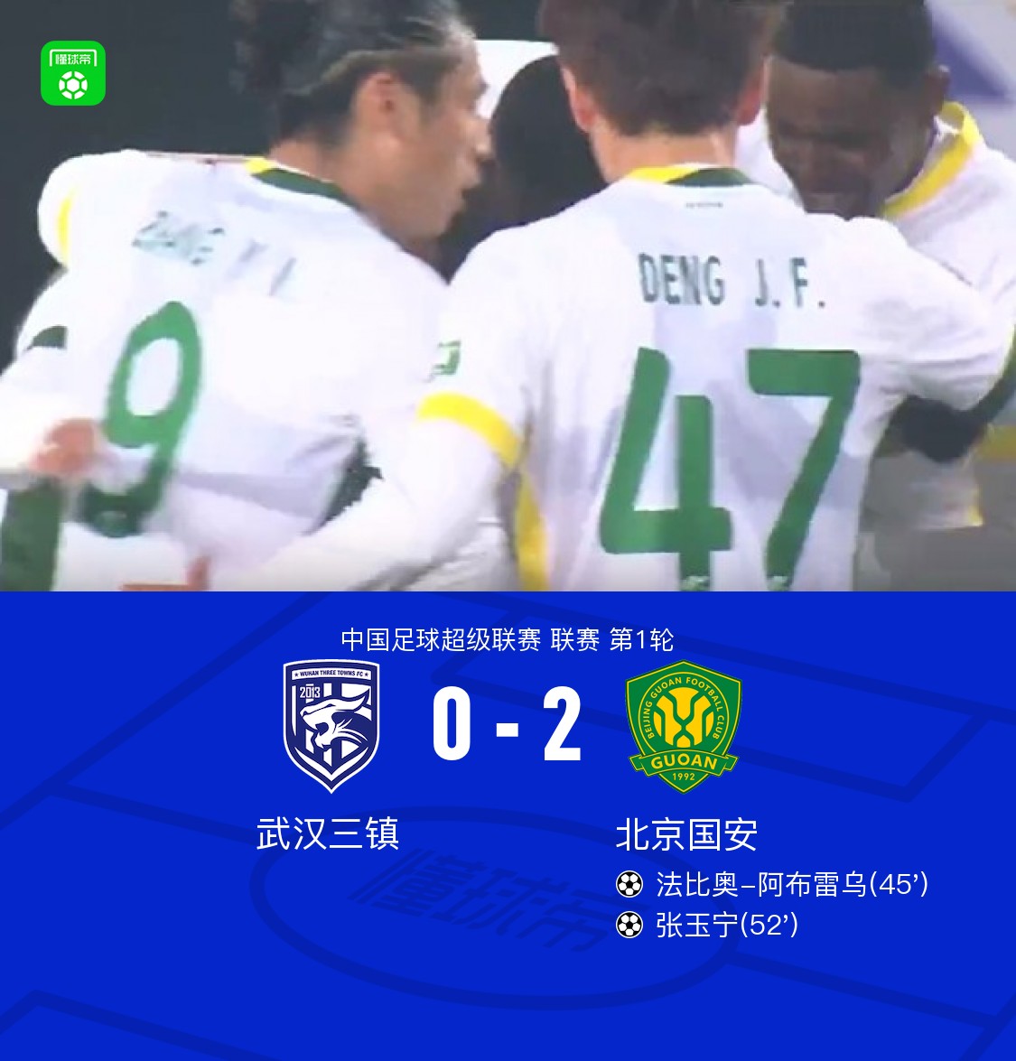 北京时间3月8日中国足球超级联赛 联赛 第1轮,武汉三镇主场对阵北京国安。北京国安法比奥-阿布雷乌破门,张玉宁破门。最终比分武汉三镇 0–2 北京国安。