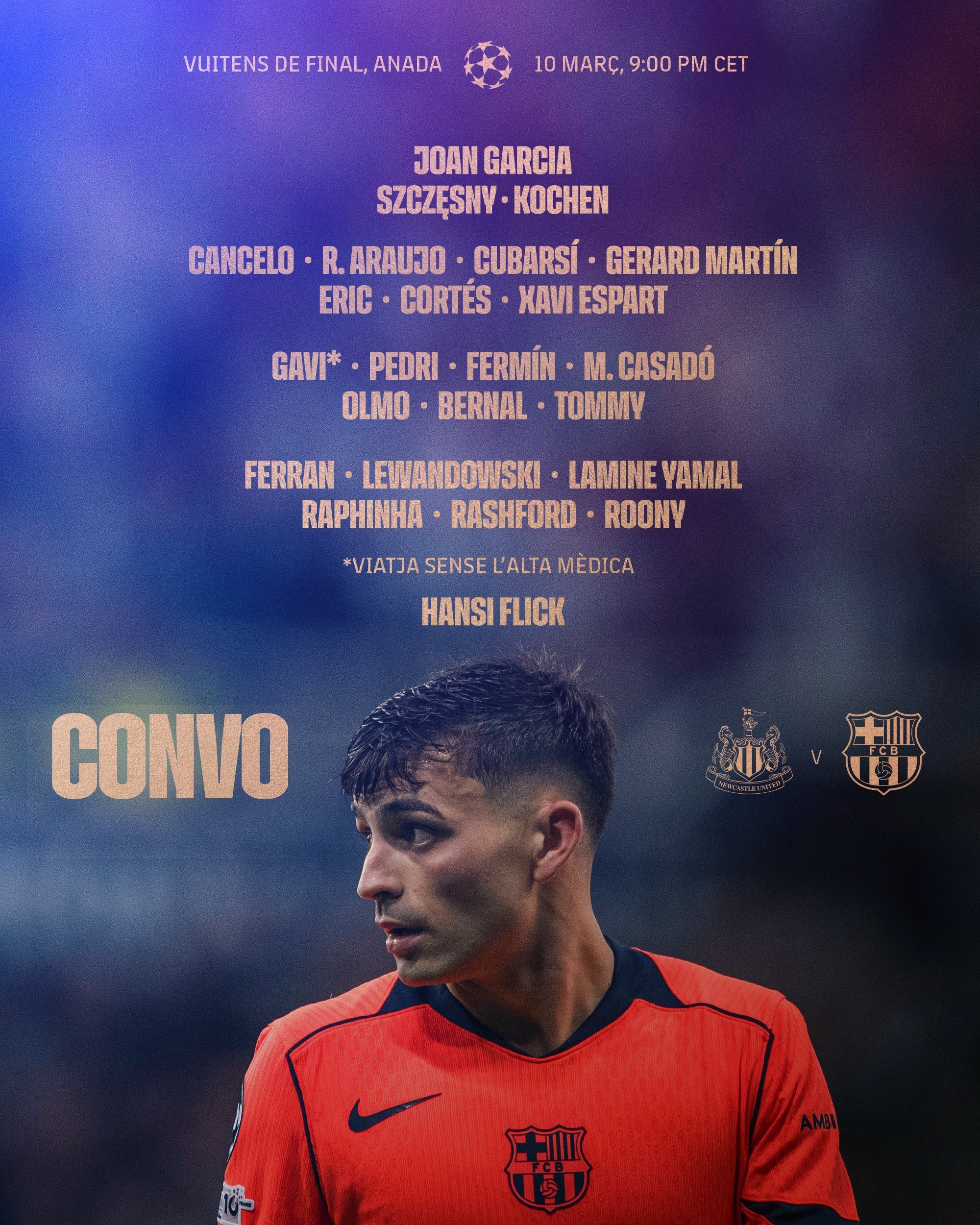 北京时间3月8日,巴萨官方公布了欧冠1/8决赛首回合对阵纽卡斯尔联的大名单。