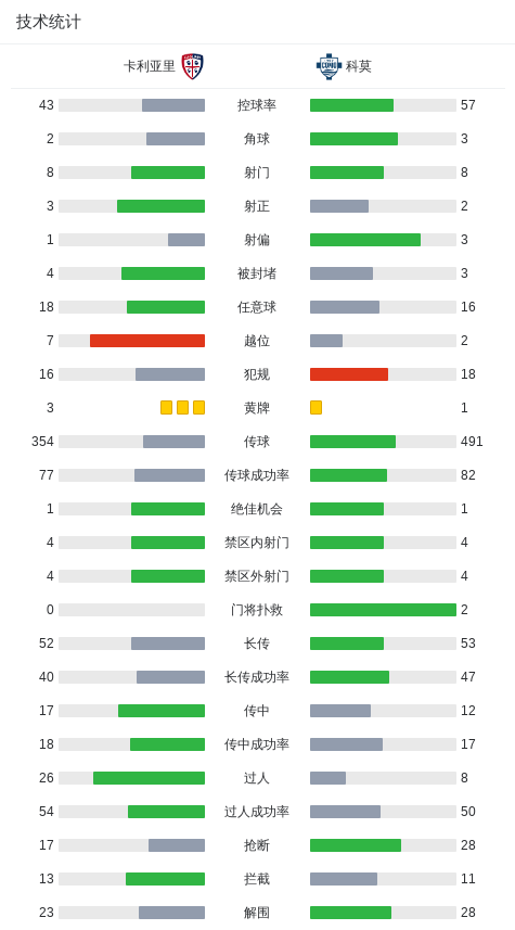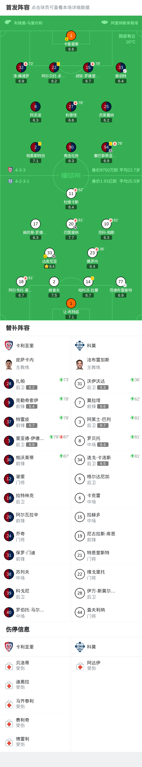 北京时间3月7日意大利足球顶级联赛第28轮,卡利亚里主场对阵科莫。比赛中,科莫球员率先破门;随后卡利亚里球员通过配合完成破门;科莫球员又通过配合打入一球。最终比分卡利亚里1-2科莫。