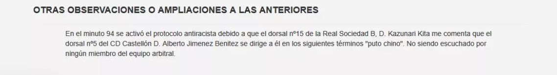 据西班牙媒体《每日体育报》报道,比赛中,皇社B队的日本后卫喜多壹也向当值主裁判阿隆索-德埃纳指控,卡斯特利翁队后卫阿尔韦托-希门尼斯对其进行辱骂,称他为 “该死的中国佬”。