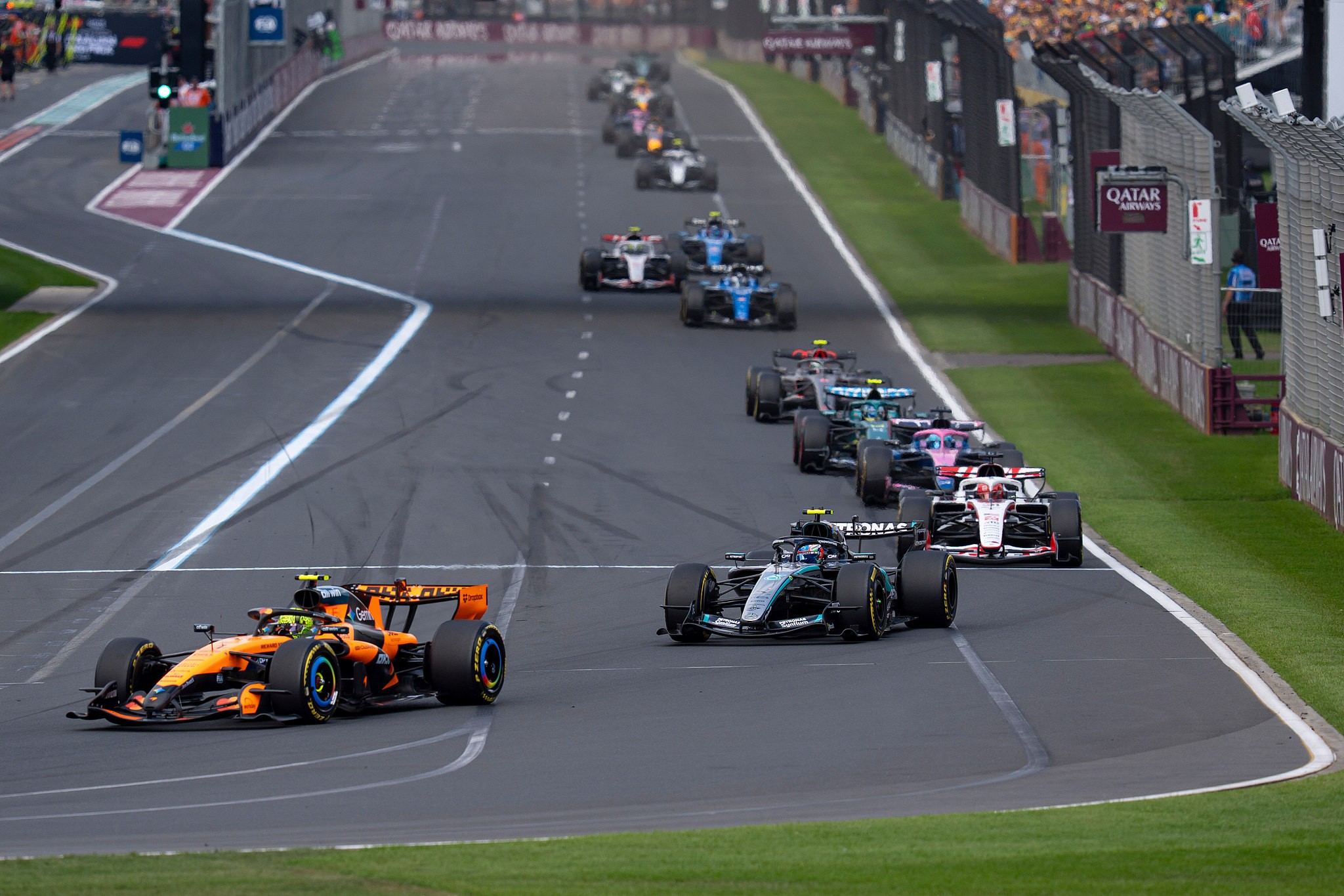 比赛初期,阿尔伯特公园赛道上出现了一波非常激烈的超车潮,其中包括拉塞尔与勒克莱尔之间的攻防战。