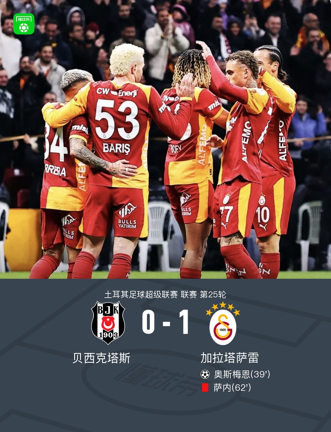 北京时间3月8日土耳其足球超级联赛 联赛 第25轮,贝西克塔斯主场对阵加拉塔萨雷。加拉塔萨雷奥斯梅恩破门。最终比分贝西克塔斯 0–1 加拉塔萨雷。