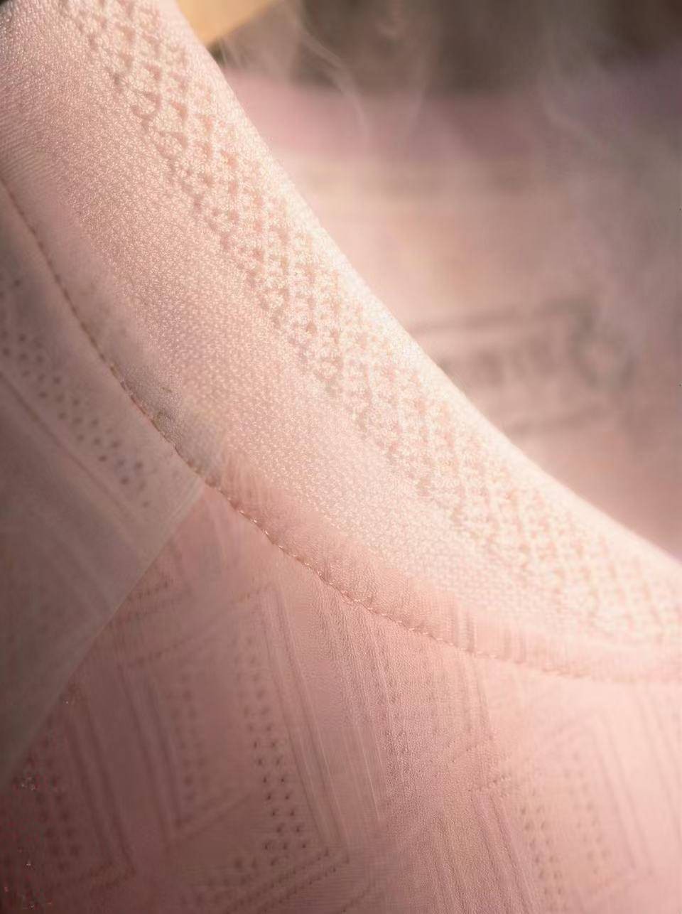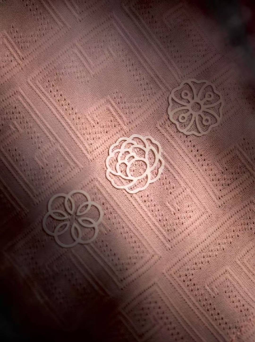 衣身皓白为底,淡粉柔韵潜入,点缀樱、杏、牡丹三花清姿,藏坚韧于清雅,融牵挂于肌理,诠释同心同行的联合力量:千里征战,凯旋高歌