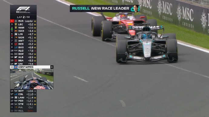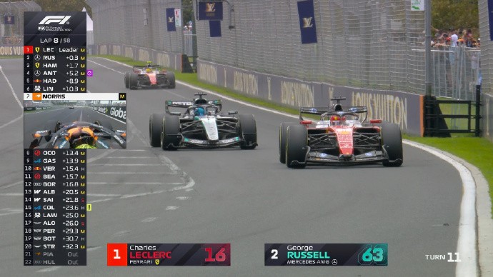进行到第8圈时,勒克莱尔和拉塞尔又两次互换了位置,勒克莱尔暂时还在第1