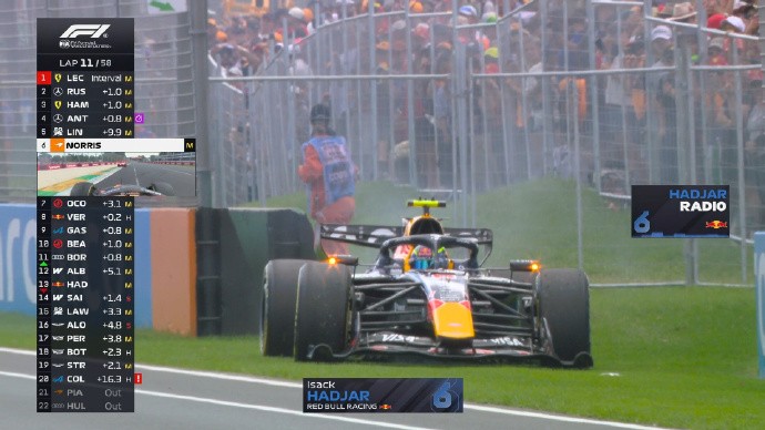 第11圈:哈贾尔引擎爆缸停在路边,虚拟安全车出动,他也将退出比赛
