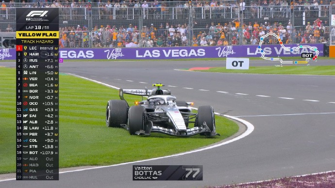 第18圈:博塔斯的赛车停在草坪上,他也退赛了,虚拟安全车再次出动
