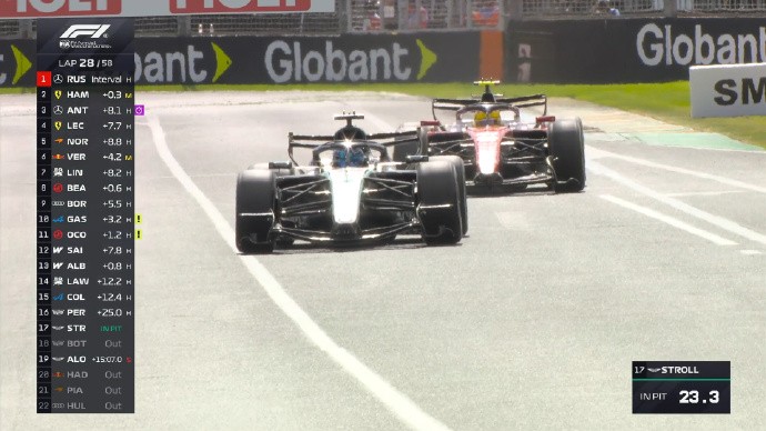 第28圈:拉塞尔超越汉密尔顿来到榜首,汉密尔顿随后完成了进站
