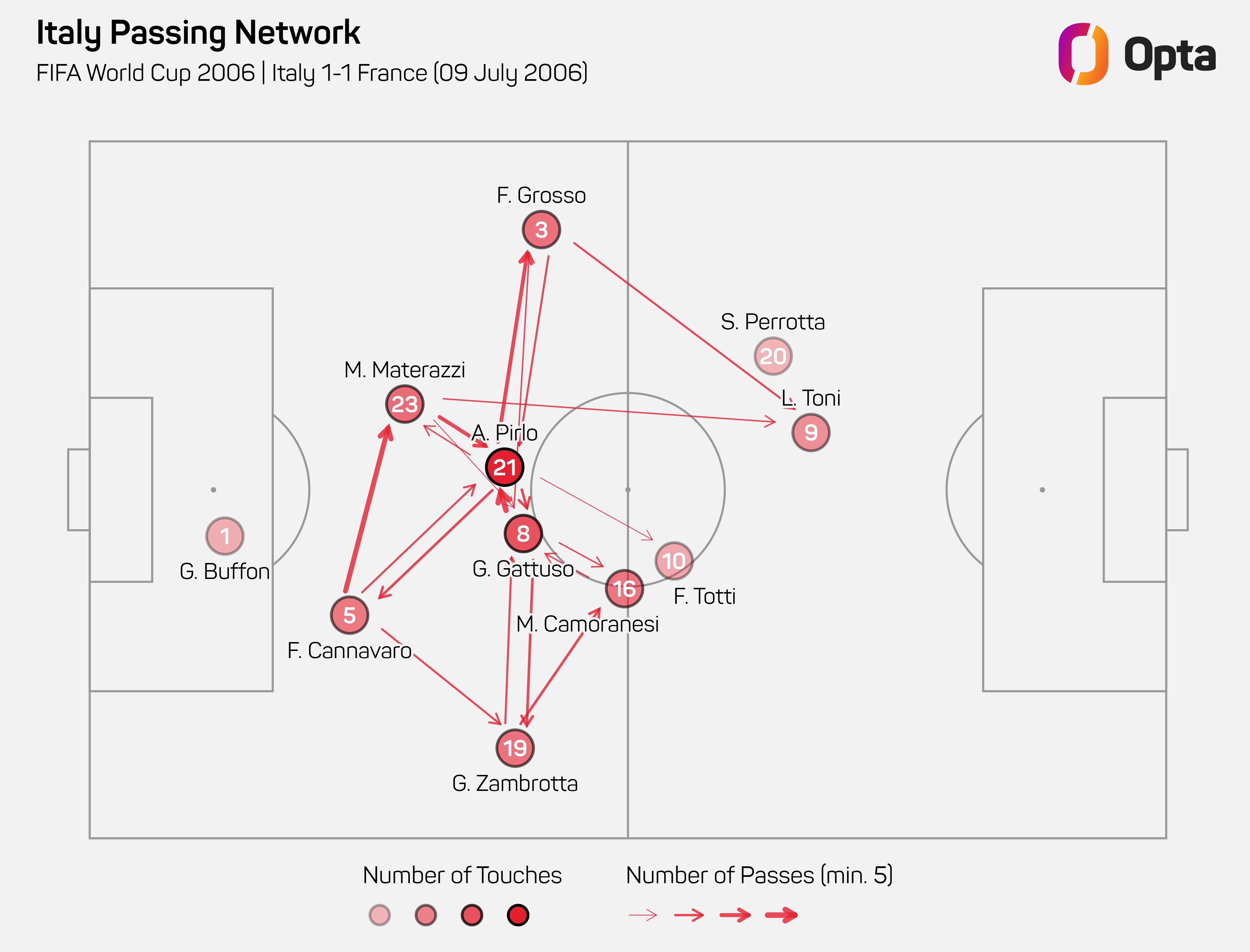 那是一个奇怪的4-2-3-1,因为前场四人组几乎起到了诱饵作用,而非主要进攻威胁。佛罗伦萨的卢卡–托尼刚刚赢得了欧洲金靴奖,他的31个进球是近半个世纪以来意甲联赛的最高纪录。但他在那届世界杯上仅在一场比赛中进球——四分之一决赛3-0战胜乌克兰的比赛中梅开二度。传奇人物托蒂出任10号位,但人们赞扬更多的是他的跑动而非天赋。毛罗–卡莫拉内西是出生于阿根廷的勤奋型中场,而非“真正”的边锋,而出生于英格兰的西蒙内–佩罗塔通常是一名中前卫,但在边路也尽职尽责。