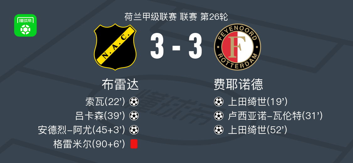北京时间3月8日荷兰甲级联赛 联赛 第26轮,布雷达主场对阵费耶诺德。布雷达索瓦破门,吕卡森破门,安德烈-阿尤破门。费耶诺德上田绮世梅开二度,卢西亚诺-瓦伦特破门。最终比分布雷达 3–3 费耶诺德。
