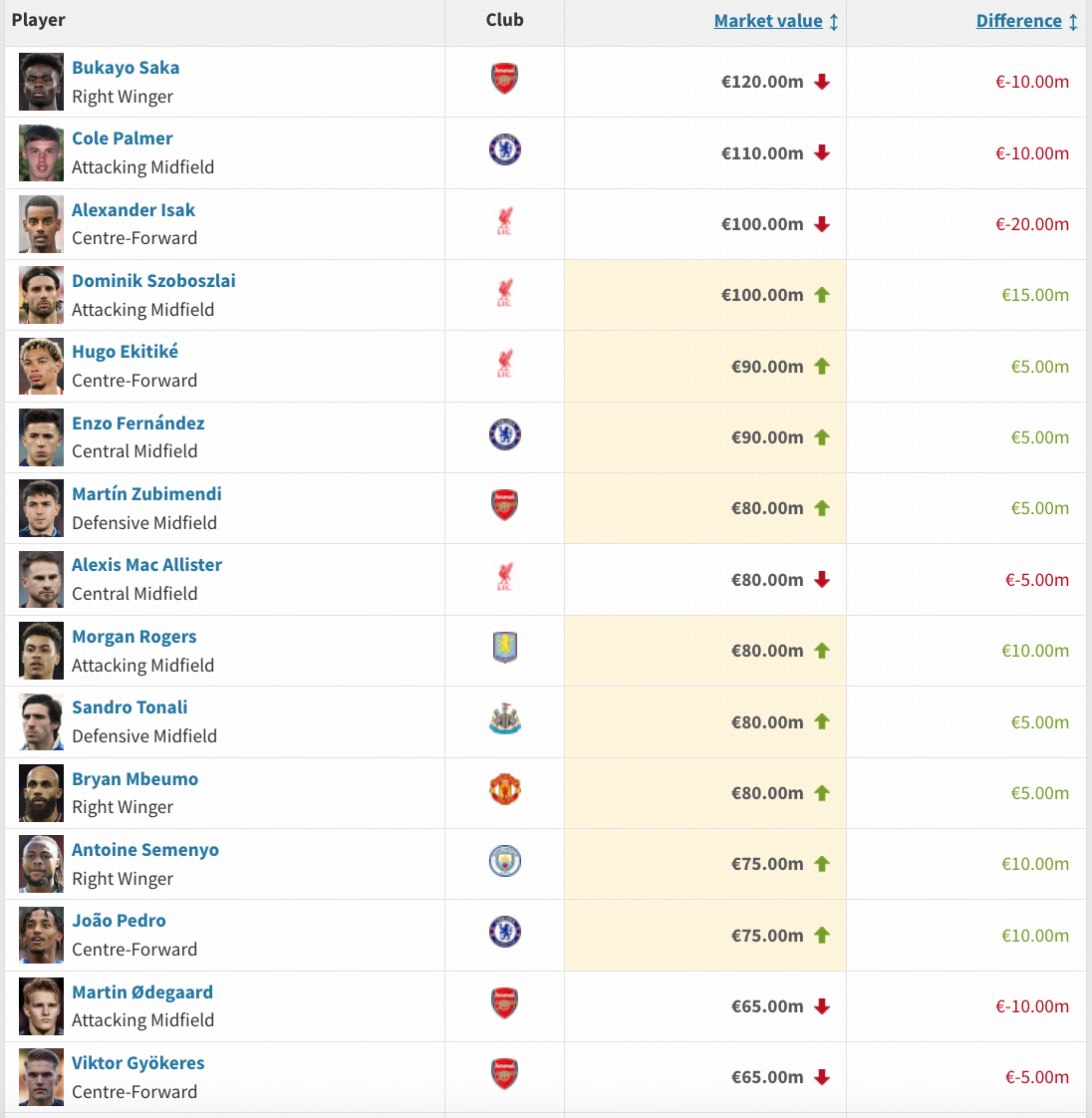 英超身价更新:萨卡降至1.2亿欧,索博涨至1亿欧,伊萨克下跌2000万欧 更多消息,稍后带来。 文章导航 维护主帅权威,图片报:克洛普刻意不在莱比锡更衣室发表讲话 德转更新英超球员身价前10:哈兰德2亿第1,萨卡、赖斯1.2亿第2