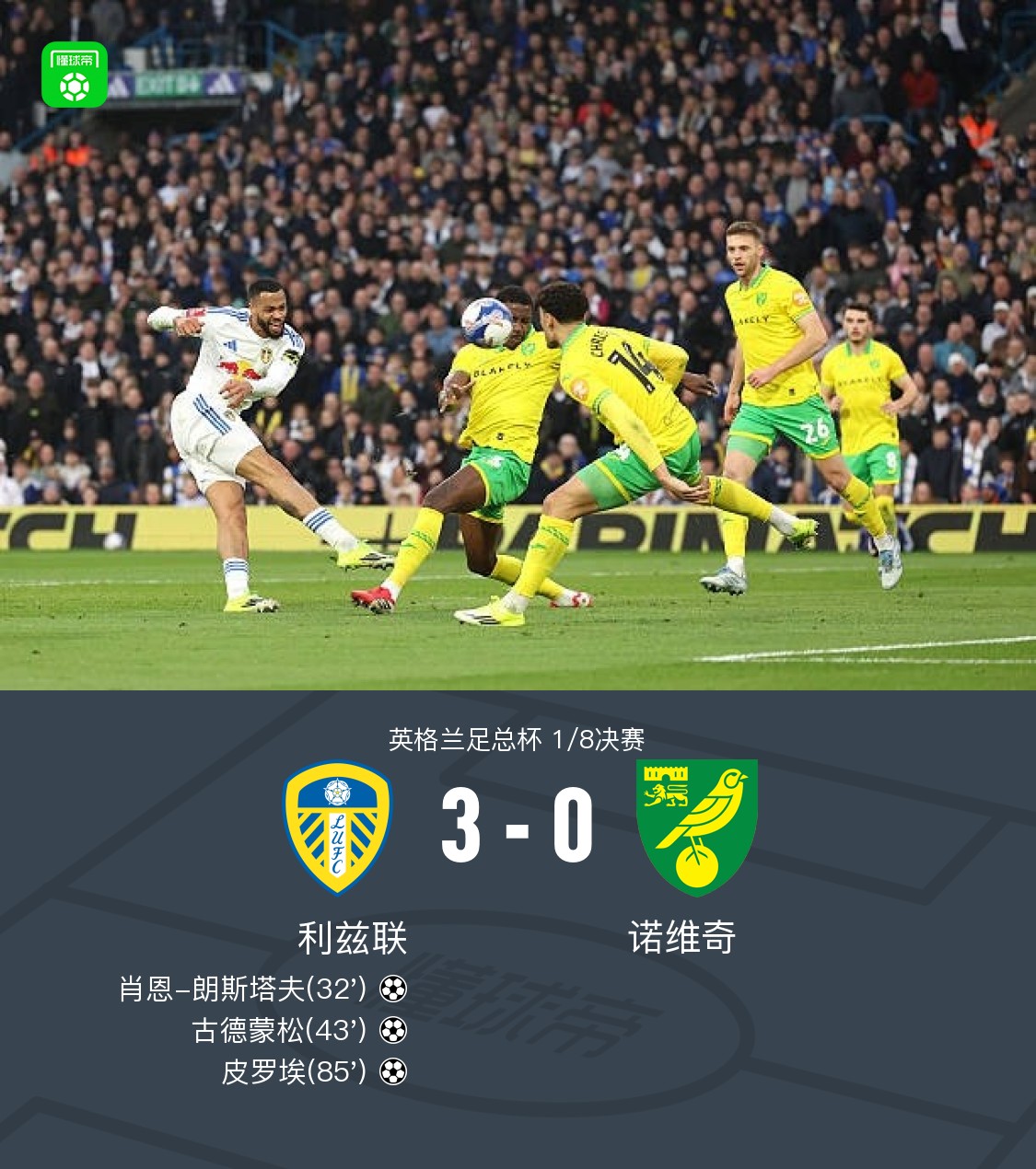 北京时间3月9日英格兰足总杯 1/8决赛,利兹联对阵诺维奇。利兹联肖恩-朗斯塔夫破门,古德蒙松破门,皮罗埃破门。最终比分利兹联 3–0 诺维奇。