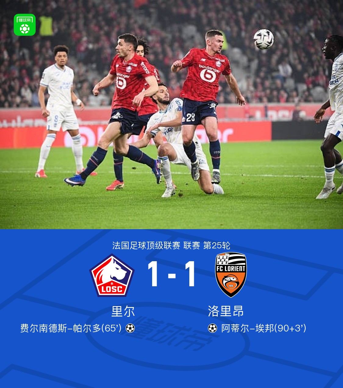 北京时间3月9日法国足球甲级联赛第25轮,里尔主场对阵洛里昂。比赛中,里尔球员通过配合由费尔南德斯-帕尔多打入一球;下半场补时阶段,洛里昂球员通过配合由阿蒂尔-埃邦打入一球。最终比分里尔1-1洛里昂。