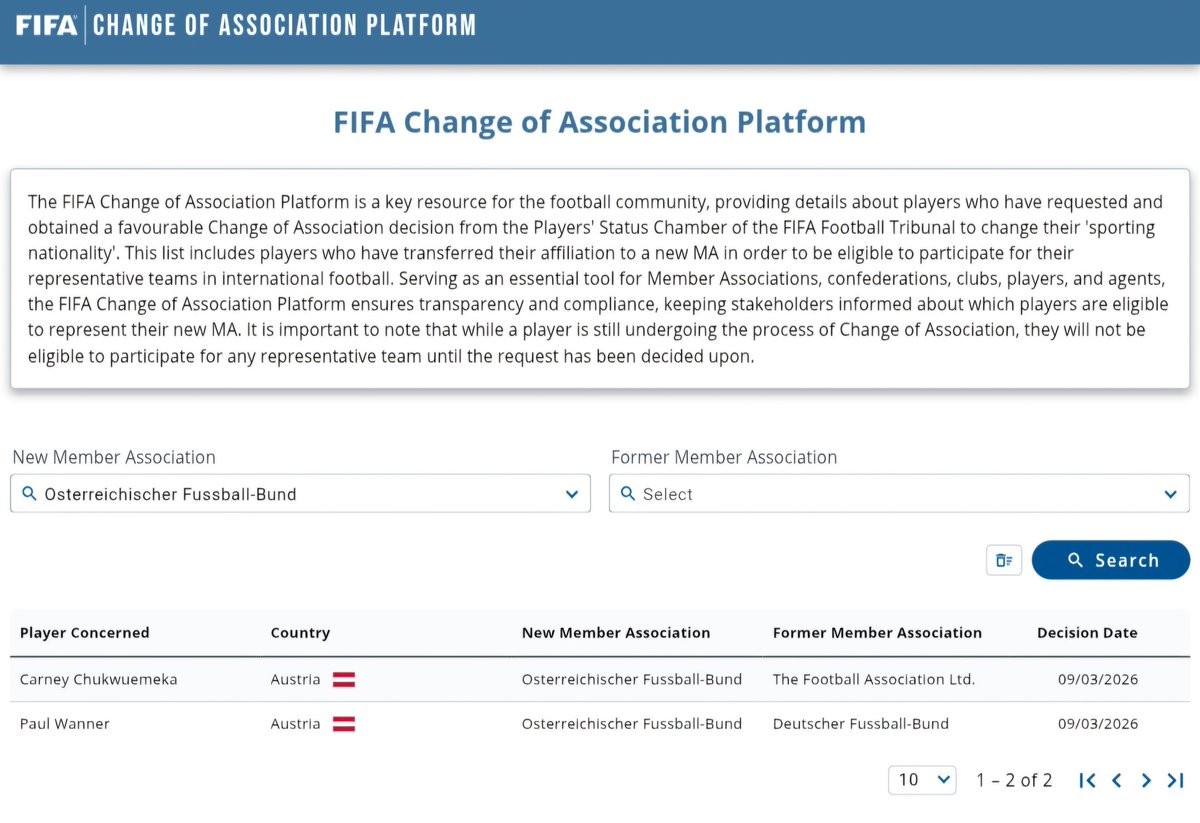 据平台信息显示,丘库埃梅卡(原会籍英格兰足协)和保罗-瓦纳(原会籍德国足协)的会籍已正式变更为奥地利足协。