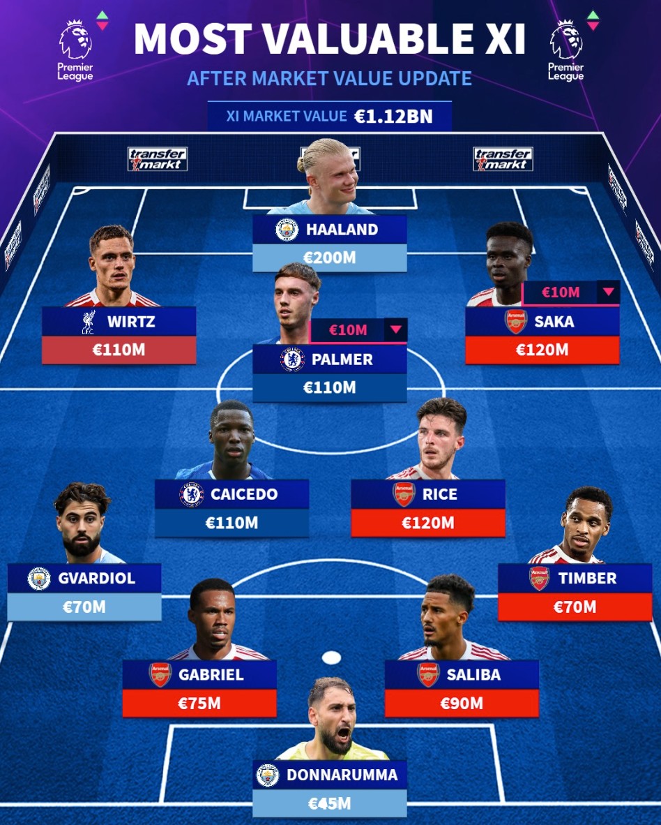 北京时间3月10日,在更新了英超球员的身价之后,德转还列出此次更新后英超身价最高的11人阵容,哈兰德2亿欧元领衔,6名球员身价过亿。