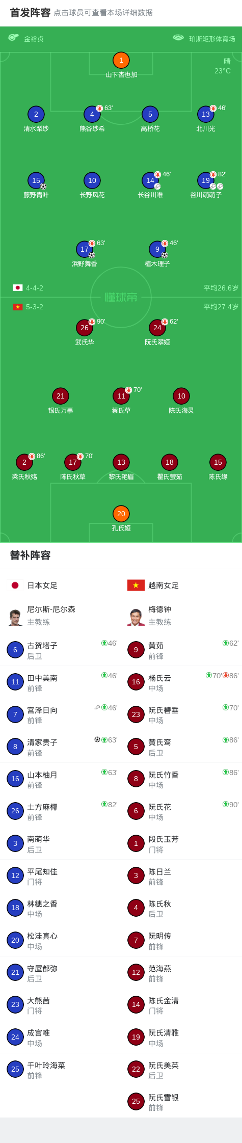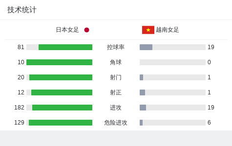 北京时间3月10日女足亚洲杯小组赛 第3轮,日本女足对阵越南女足。日本女足植木理子、浜野舞香、藤野青叶、清家贵子分别破门,谷川萌萌子送出两次助攻。最终比分日本女足4–0越南女足三连胜小组头名出线,越南女足则被淘汰。
