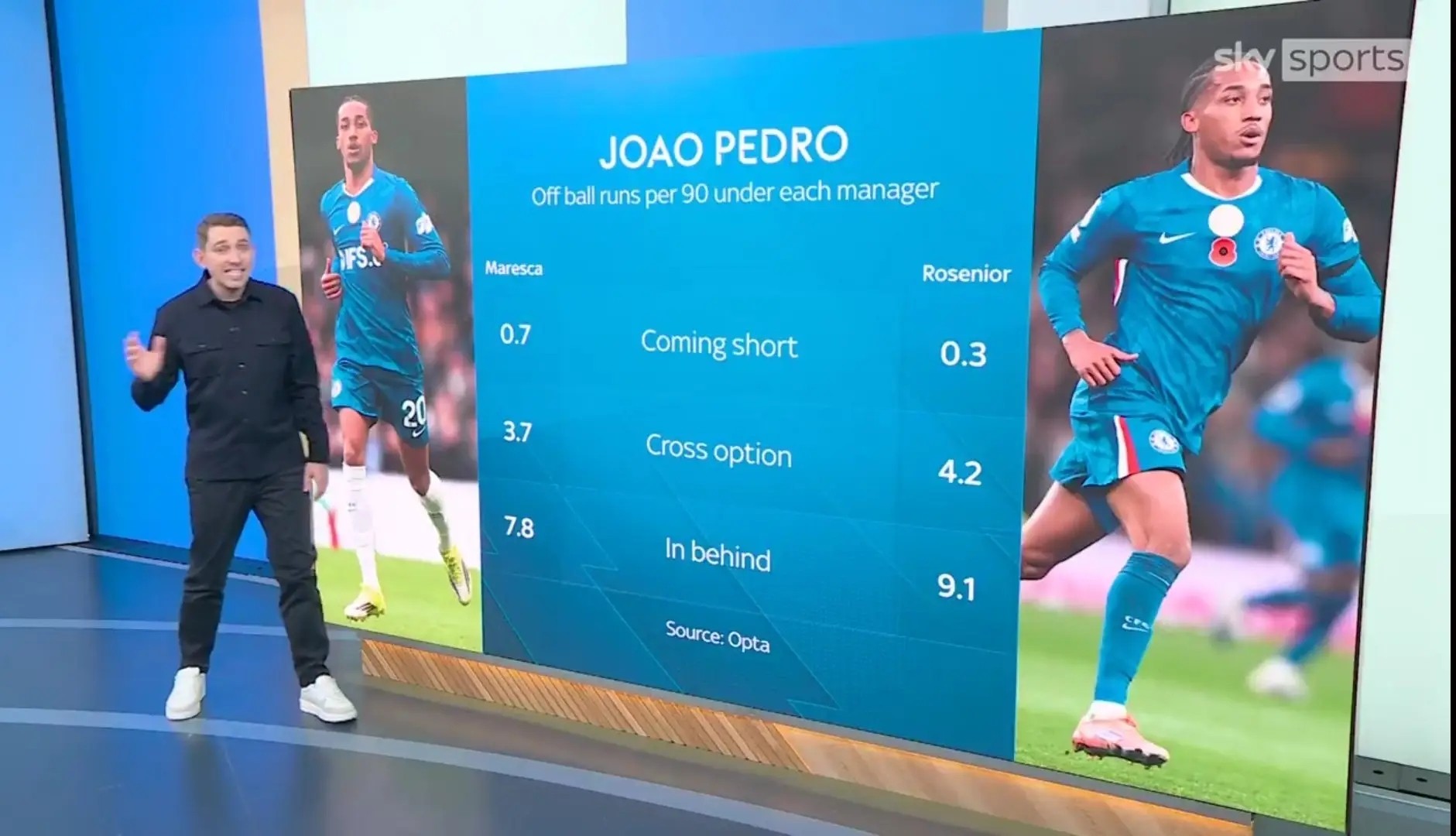日前,天空体育在节目中对比了若昂-佩德罗在马雷斯卡和罗塞尼尔治下的数据,他的热点图对比非常明显。