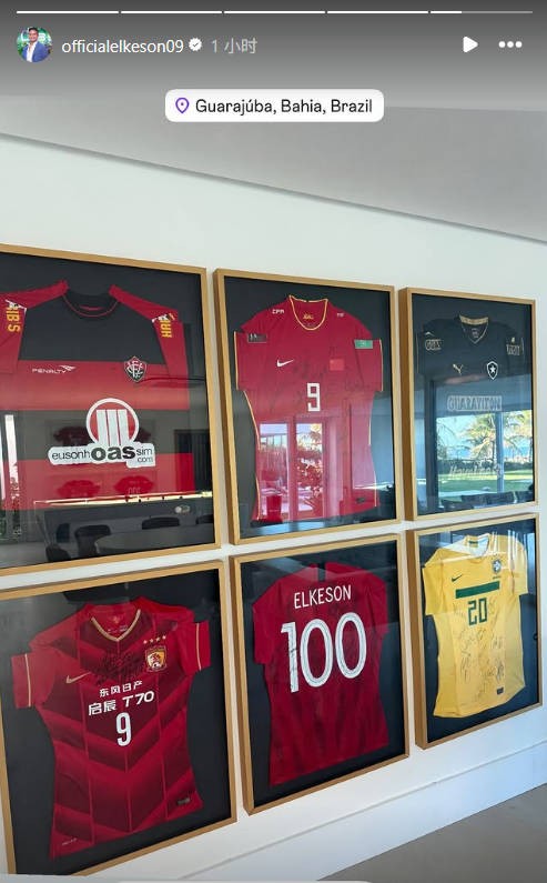 艾克森在社交媒体晒出了自己的球衣收藏,可以看到,其中包含他在国足的9号球衣、广州队的9号球衣、海港100场纪念球衣以及在巴西维多利亚、博塔弗戈和巴西U23的球衣。