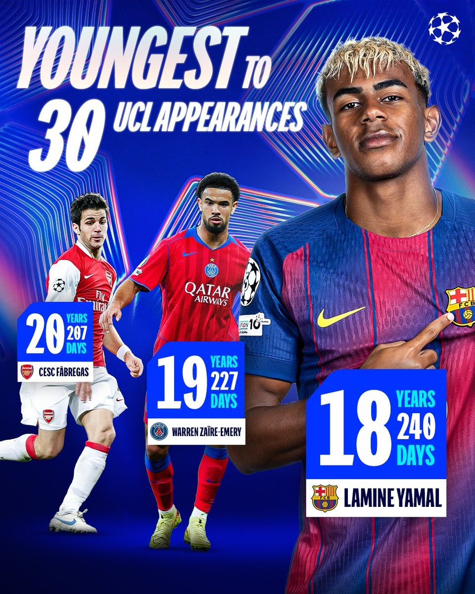 据统计,18岁240天的亚马尔成为欧冠联赛历史上出场次数达到30场最年轻的球员。