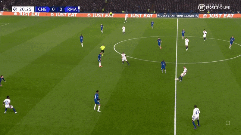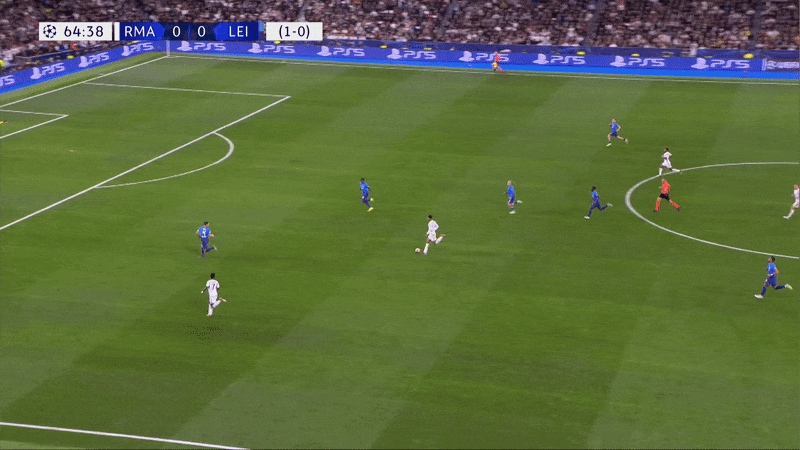 当维尼修斯能与队友配合并前插身后时,他在肋部区域就能构成威胁,就像下图中他在2021-22赛季四分之一决赛对阵切尔西时助攻本泽马那样。