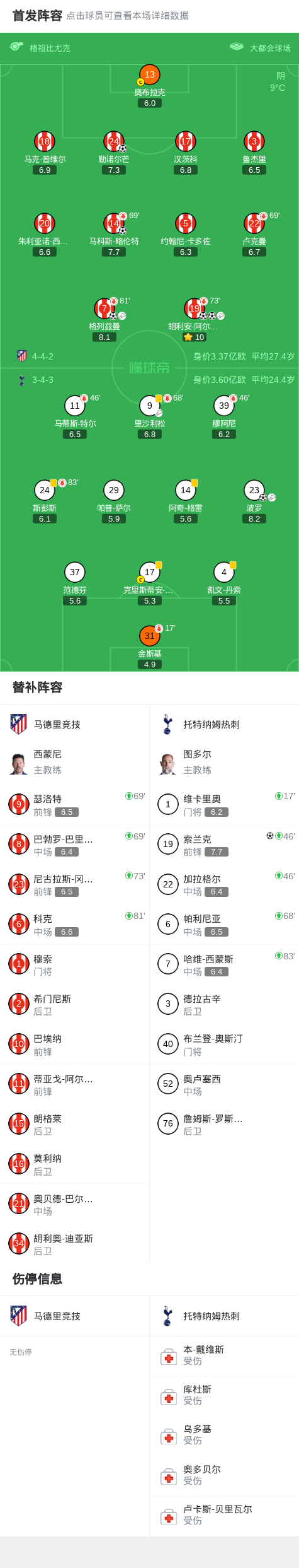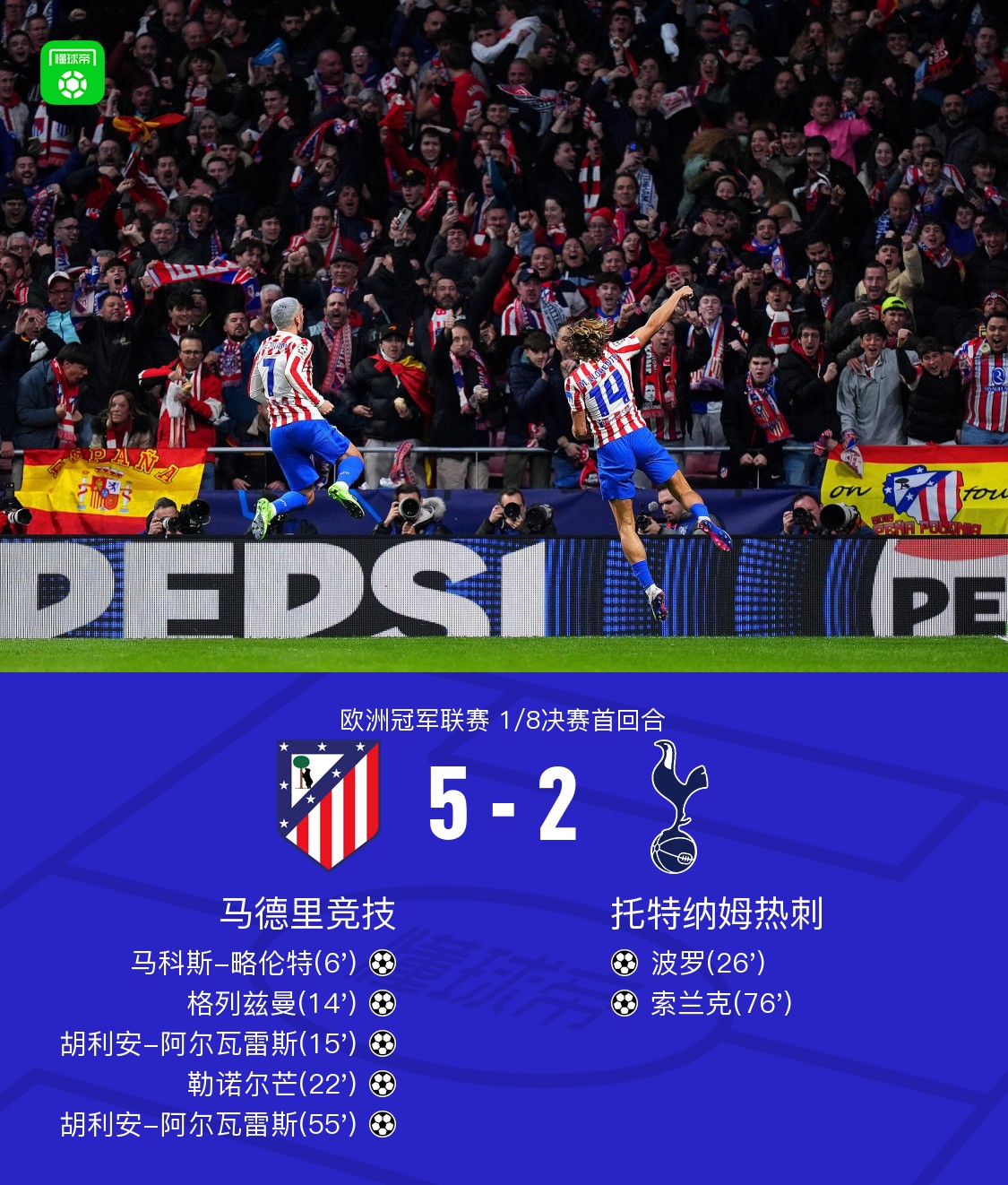 北京时间3月11日4:00,欧冠1/8决赛首回合,马德里竞技坐镇利雅得航空大都会球场迎战托特纳姆热刺,本场主裁判为格祖比尤克。上半场,热刺首发门将金斯基两送大礼后被换下,马竞多点开花,略伦特、格列兹曼、阿尔瓦雷斯、勒诺尔芒先后破门,波罗扳回一城。下半场,阿尔瓦雷斯奔袭再下一城,索兰克替补破门。最终,马竞主场5-2热刺。