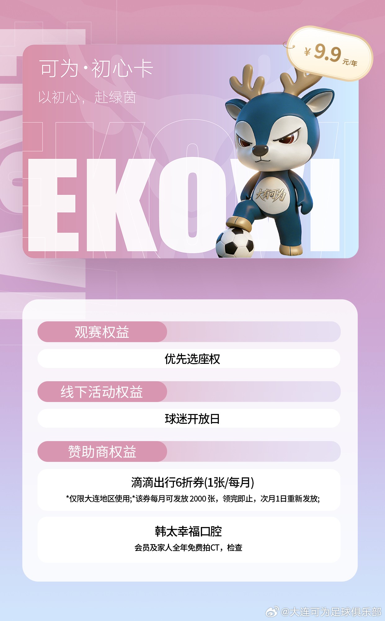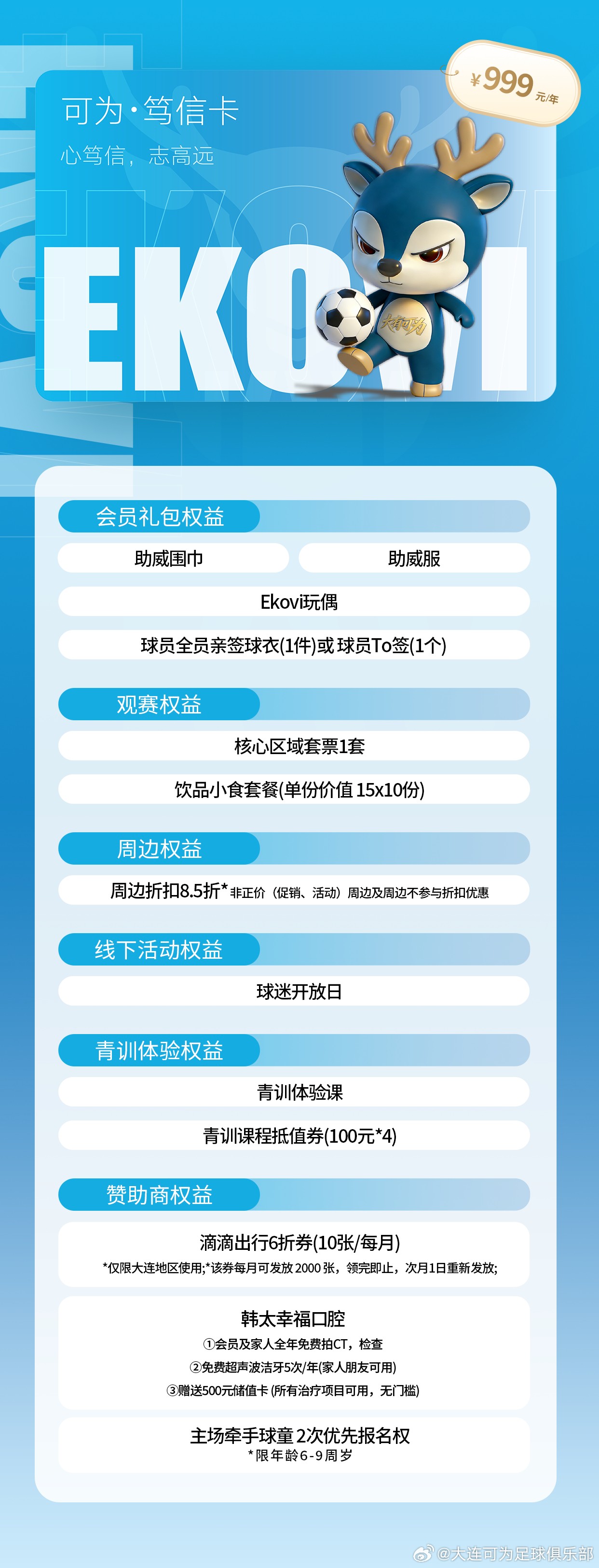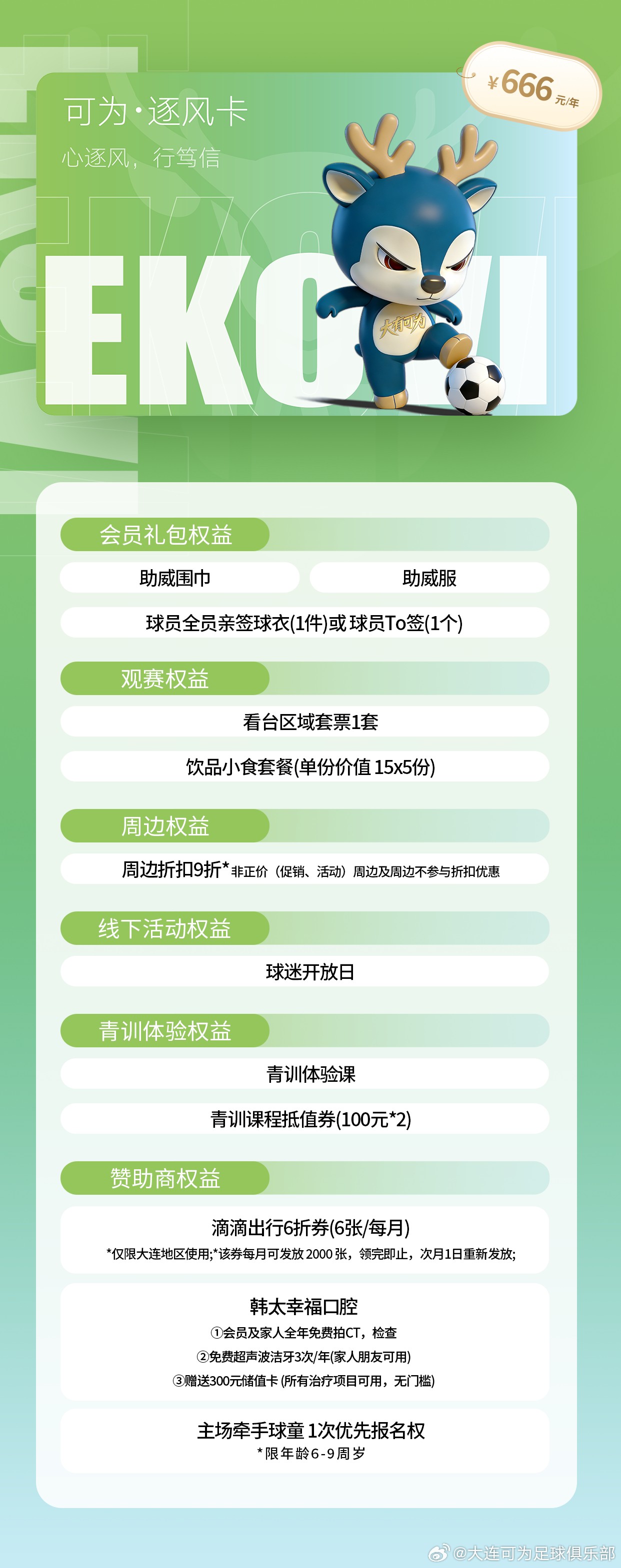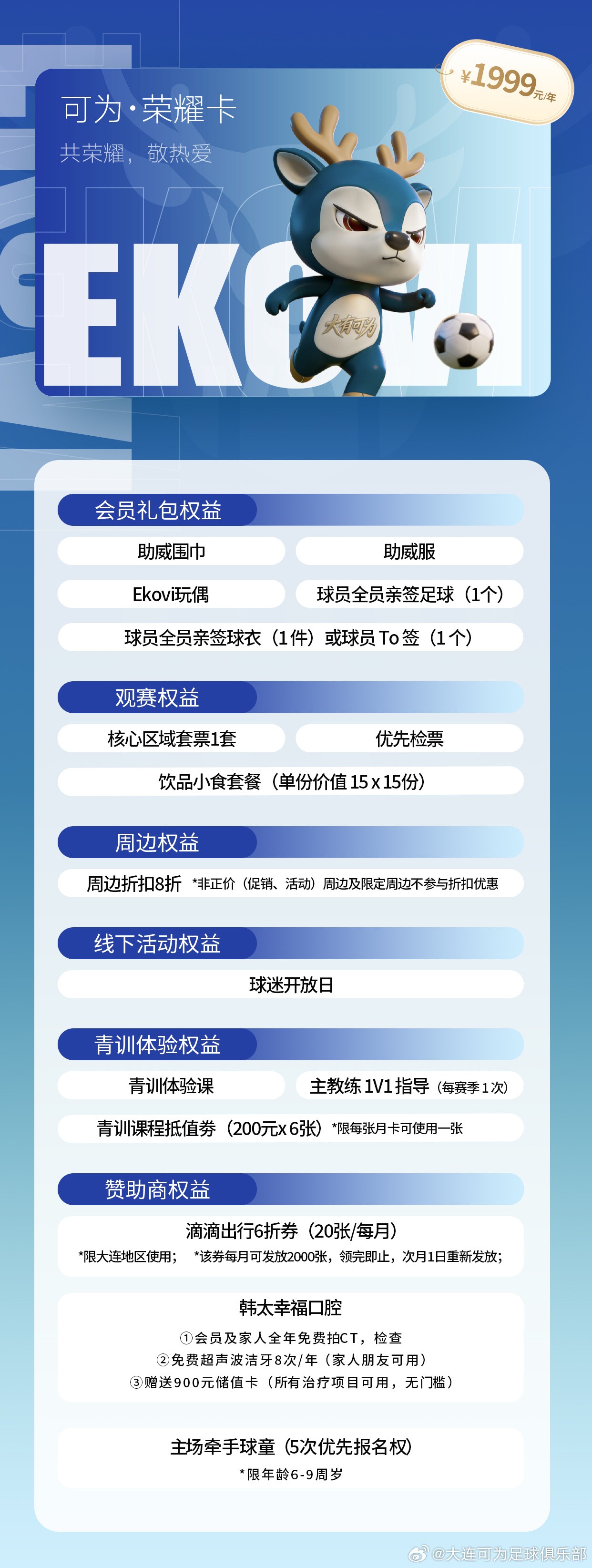 大连可为共推出五档不同价位的会员,各档位卡种均搭配观赛、周边、线下活动、青训体验及赞助商专属权益,且权益随卡种价位提升逐步升级。