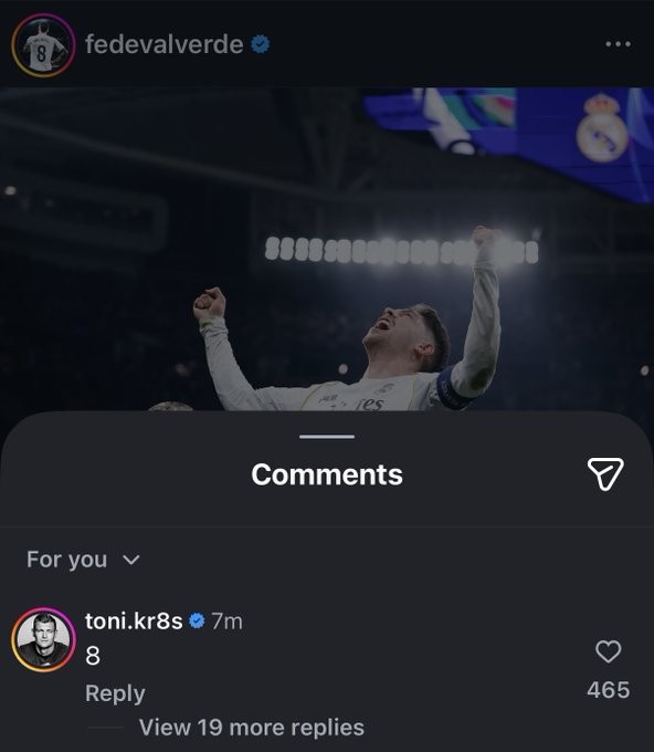 巴尔韦德在社交媒体上晒出了自己庆祝进球的照片,并配文:“无需多言”,随后,克罗斯在这条动态下评论了一个“8”。