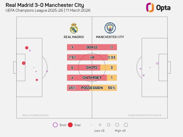 欧冠1/8决赛首回合,皇家马德里主场对阵曼城,上半场战罢皇马3-0领先,这是皇马自2014年以来首次在欧冠淘汰赛上半场打入3球。