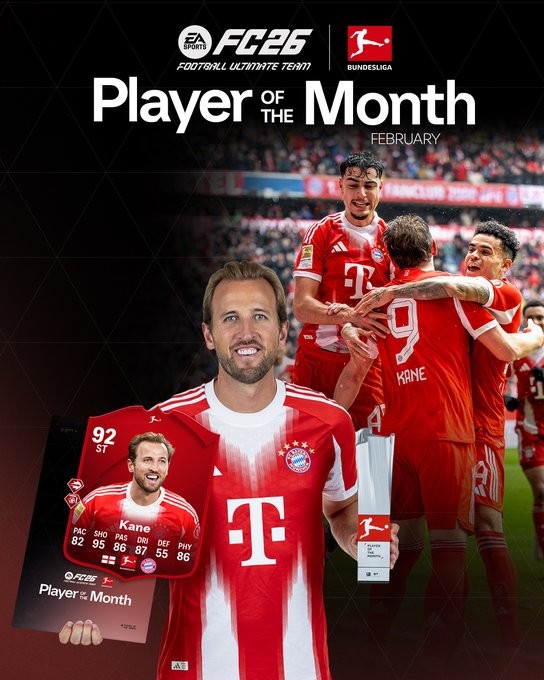北京时间3月12日,德甲官方发布公告,宣布凯恩当选二月最佳球员。