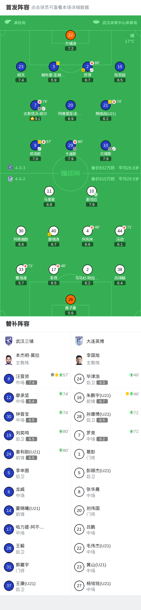 北京时间3月13日中国足球超级联赛 联赛 第2轮,武汉三镇主场对阵大连英博。武汉三镇卡迪斯破门,古斯塔沃-绍尔破门,贝维斯破门,汪晋贤破门。大连英博斯坦丘破门。最终比分武汉三镇 41 大连英博。