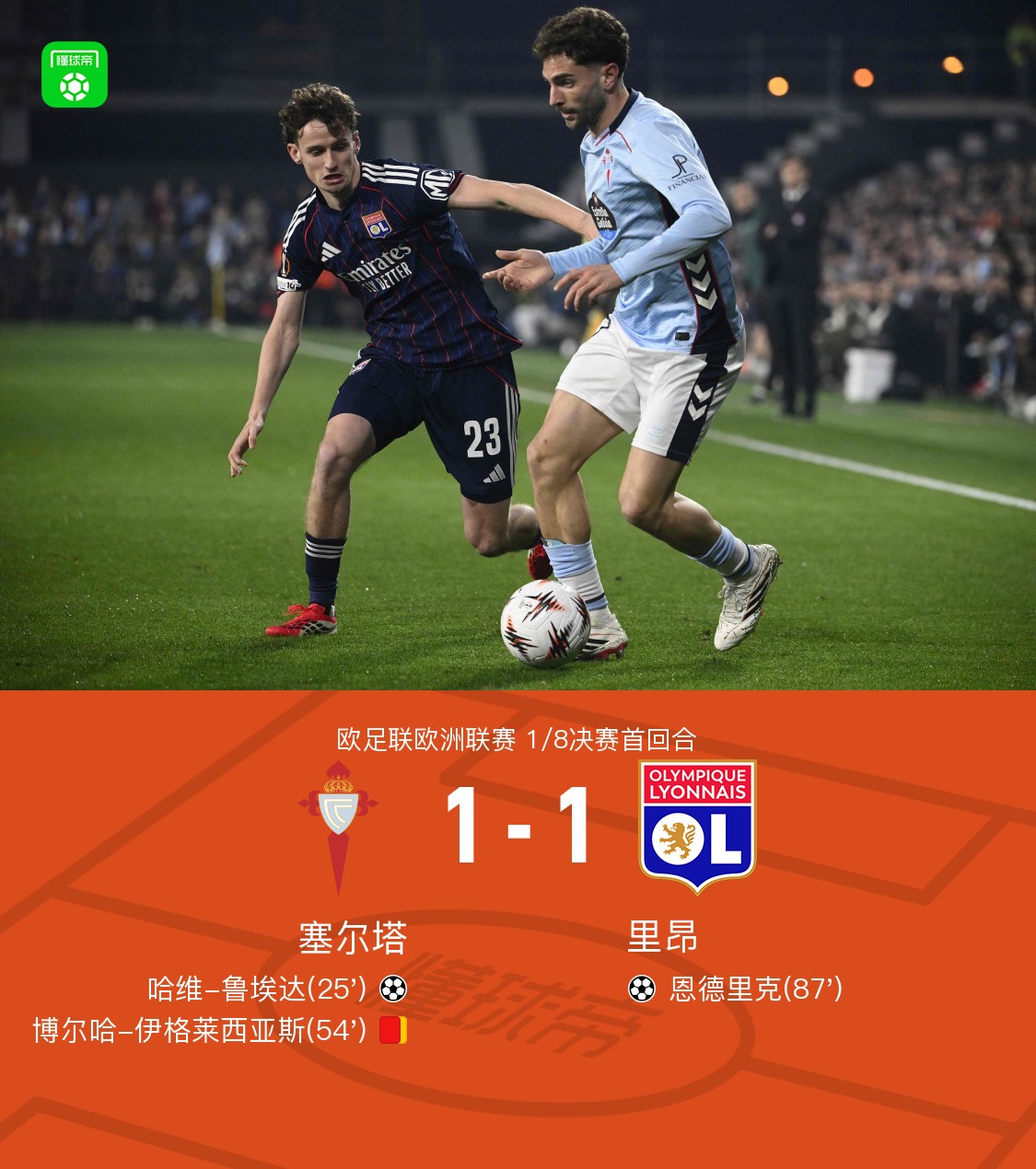北京时间3月13日欧足联欧洲联赛 1/8决赛首回合,塞尔塔对阵里昂。塞尔塔哈维-鲁埃达破门。里昂恩德里克破门。最终比分塞尔塔 11 里昂。