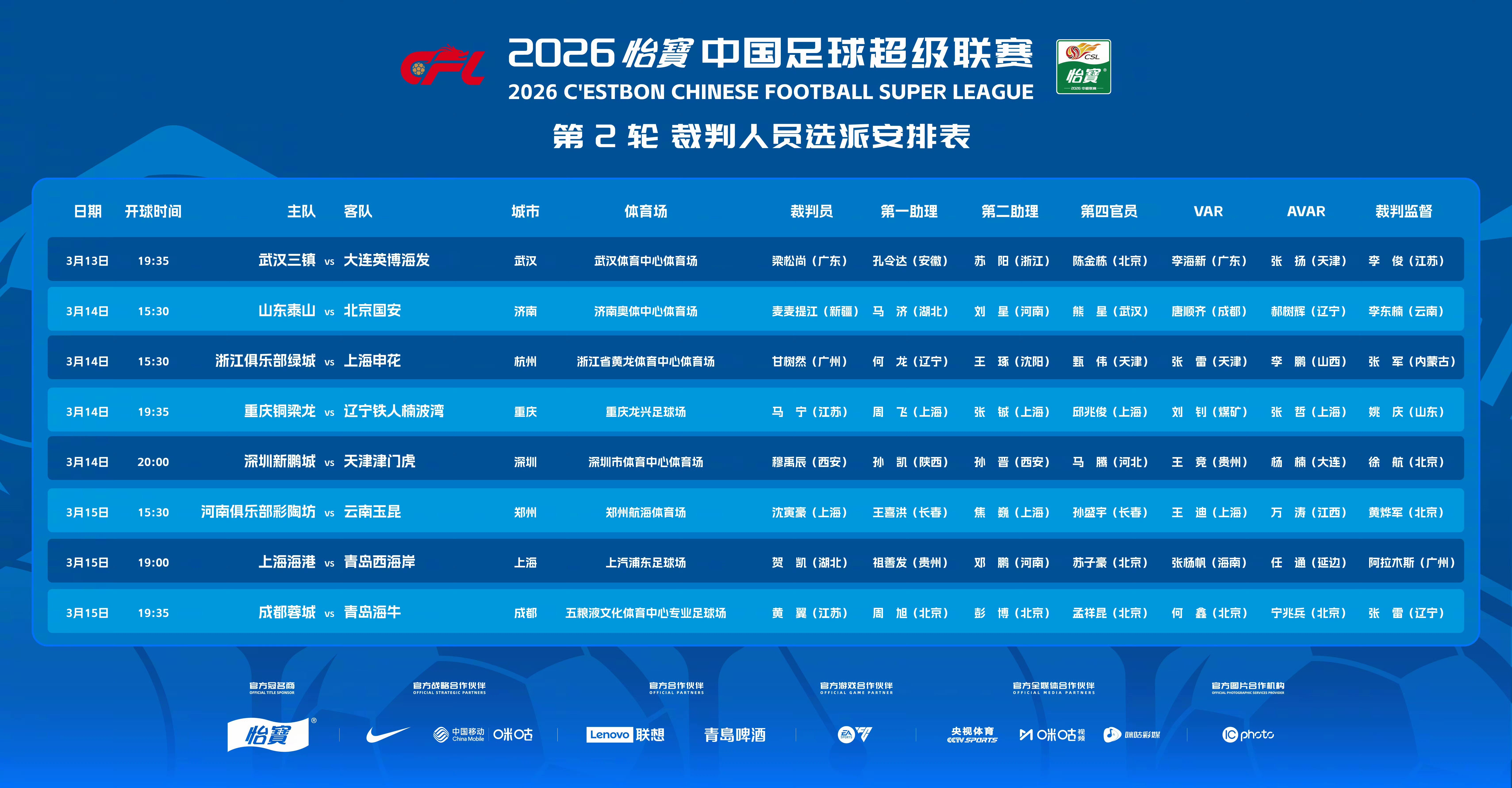 北京时间3月13日,中超第2轮裁判名单公布,麦麦提江执法京鲁大战,唐顺齐担任VAR,马宁吹重庆铜梁龙vs辽宁铁人。