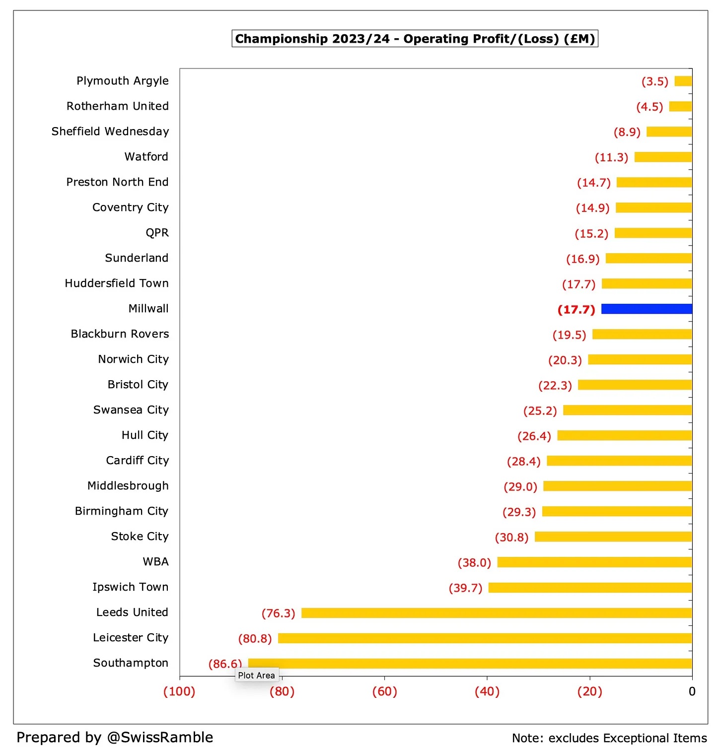 23/24赛季英冠俱乐部营业利润(亏损)统计
