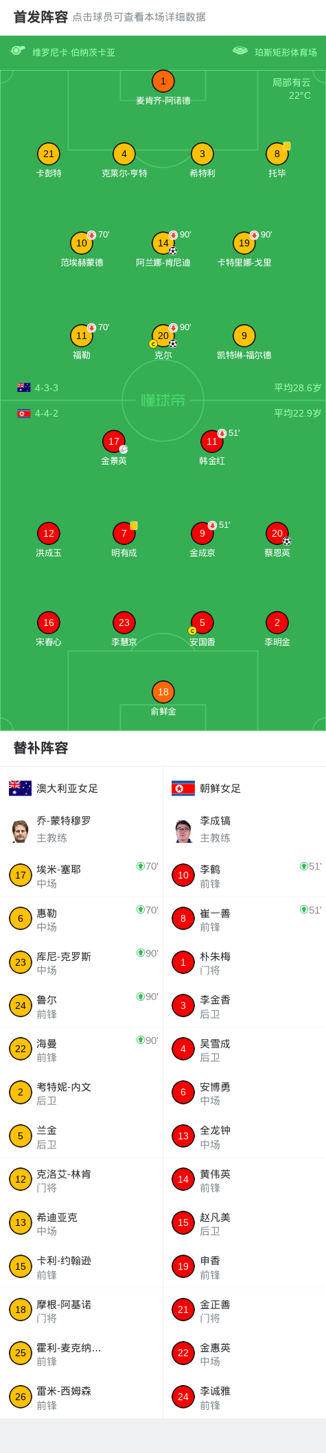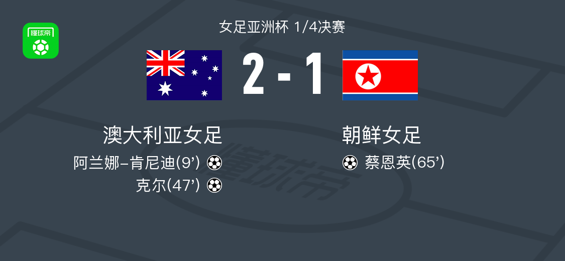 北京时间3月13日女足亚洲杯 1/4决赛,澳大利亚女足对阵朝鲜女足。澳大利亚女足阿兰娜-肯尼迪破门,克尔破门。朝鲜女足蔡恩英破门。最终比分澳大利亚女足 21 朝鲜女足。