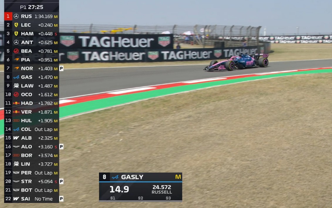 一练过半,拉塞尔排名第一,勒克莱尔第二,汉密尔顿第三。