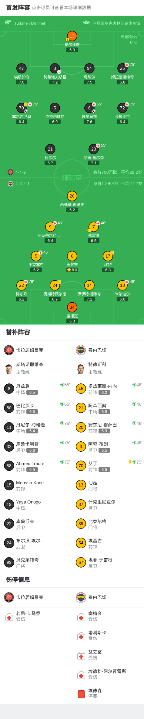 北京时间3月14日土耳其足球超级联赛 联赛 第26轮,卡拉居姆吕克主场对阵费内巴切。卡拉居姆吕克埃尔马兹破门,塞尔吉尼奥破门。最终比分卡拉居姆吕克 2–0 费内巴切。