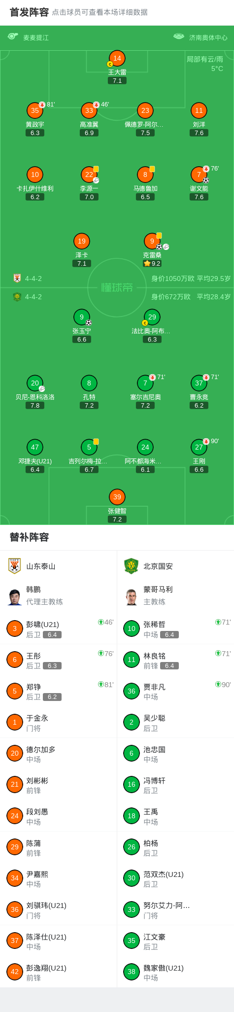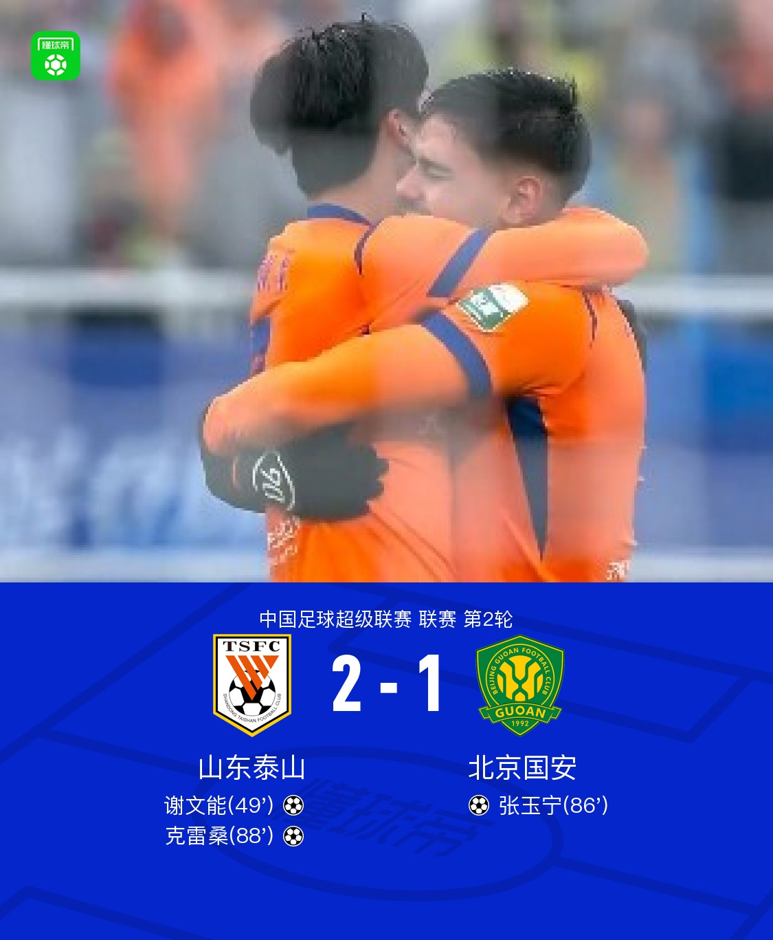 北京时间3月14日中国足球超级联赛 联赛 第2轮,山东泰山主场对阵北京国安。山东泰山谢文能破门,克雷桑破门。北京国安张玉宁破门。最终比分山东泰山 2–1 北京国安。