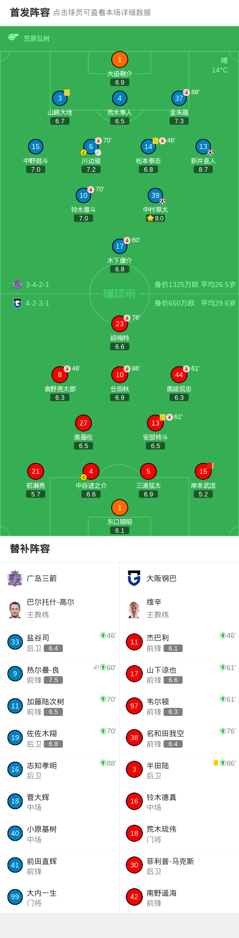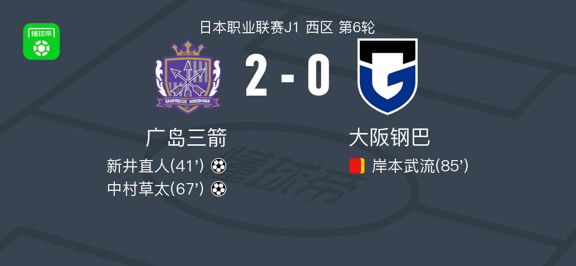 北京时间3月14日日本职业联赛J1 西区 第6轮,广岛三箭主场对阵大阪钢巴。上半场新井直人重炮攻门,东口顺昭将球扑进球门。下半场热尔曼-良助攻中村草太单刀破门,比赛尾声岸本武流犯规,裁判出示第二张黄牌将其罚下。最终广岛三箭2-0战胜大阪钢巴。