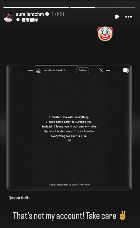 今日早些时候,有国外博主爆料楚阿梅尼发布了一条限时动态,不过目前该动态已被删除。楚阿梅尼表示:“我曾把一切都托付给你。我提前回家,本想给你一个惊喜。可结果却发现,你和他躺在我们的床上。我的心彻底碎了,连呼吸都变得困难。我们一起建立的一切,原来都是谎言。我不知道从这里开始,该怎么继续走下去。💔”