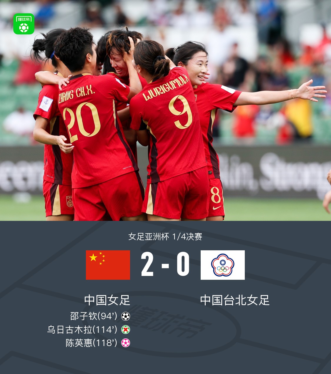 北京时间3月14日女足亚洲杯1/4决赛,中国女足对阵中国台北女足。双方常规时间0-0战平,加时赛中,邵子钦破门+造点,乌日古木拉丢点,金坤制造陈英惠乌龙。最终比分中国女足2–0中国台北女足晋级女足亚洲杯四强并成功晋级世界杯正赛。