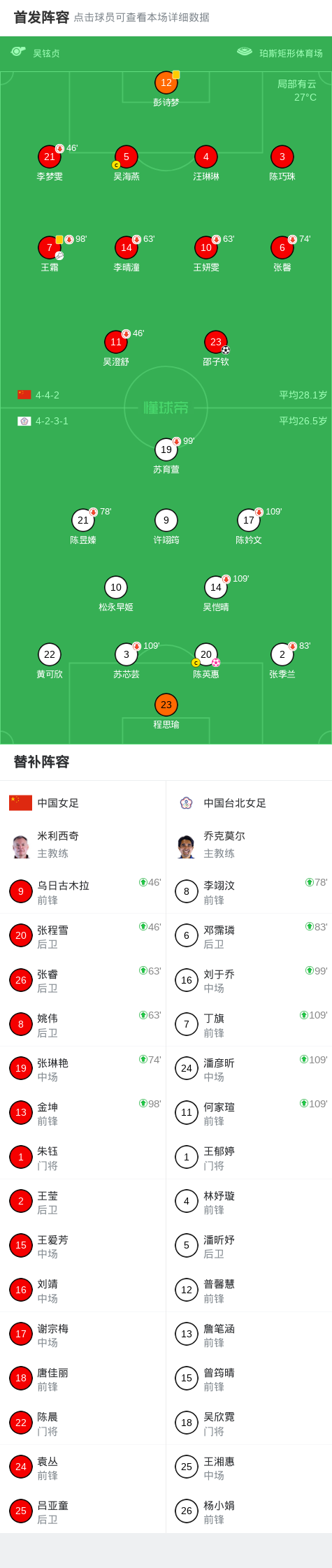第46分钟,下半场开始前张程雪、乌日古木拉登场,李梦雯、吴澄舒被换下