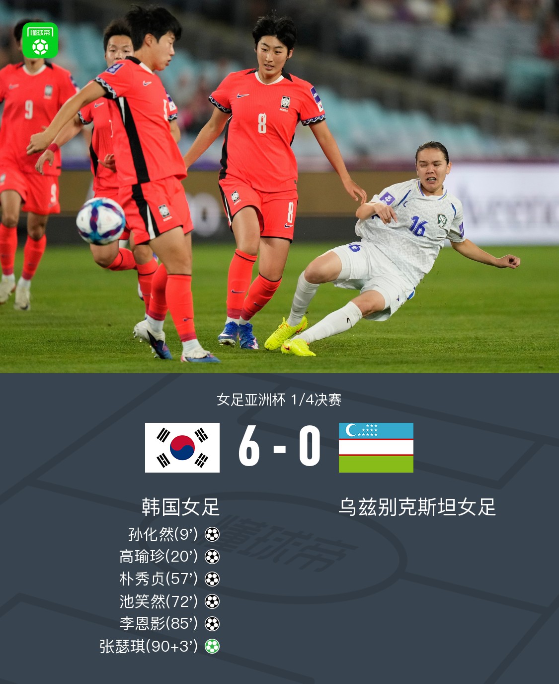 北京时间3月14日女足亚洲杯 1/4决赛,韩国女足对阵乌兹别克斯坦女足。韩国女足孙化然破门,高瑜珍破门,朴秀贞破门,池笑然破门,李恩影破门,张瑟琪破门。最终比分韩国女足 6–0 乌兹别克斯坦女足。