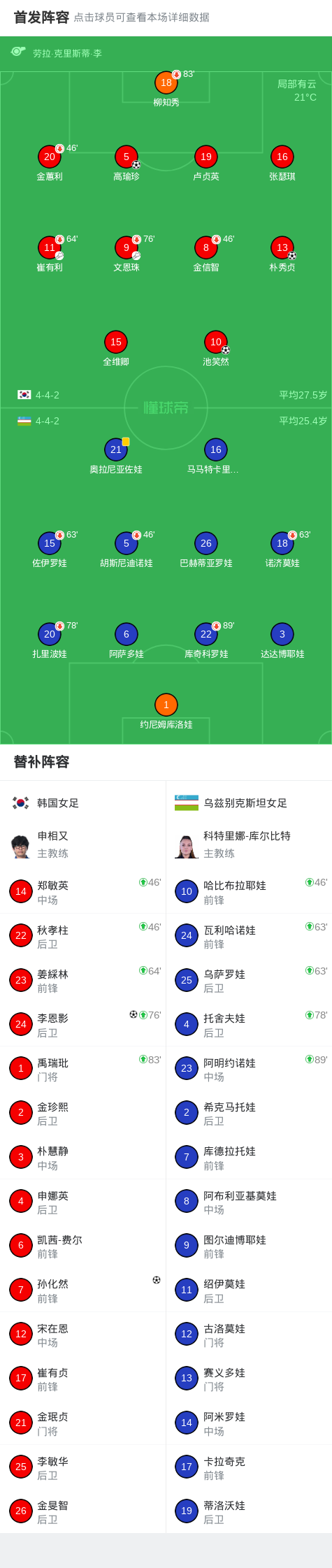第20分钟,高瑜珍弧顶处吊射破门将比分扩大,韩国2-0乌兹别克斯坦