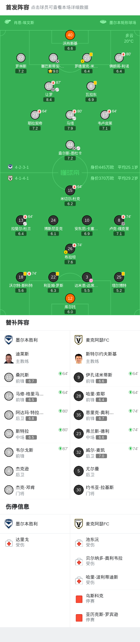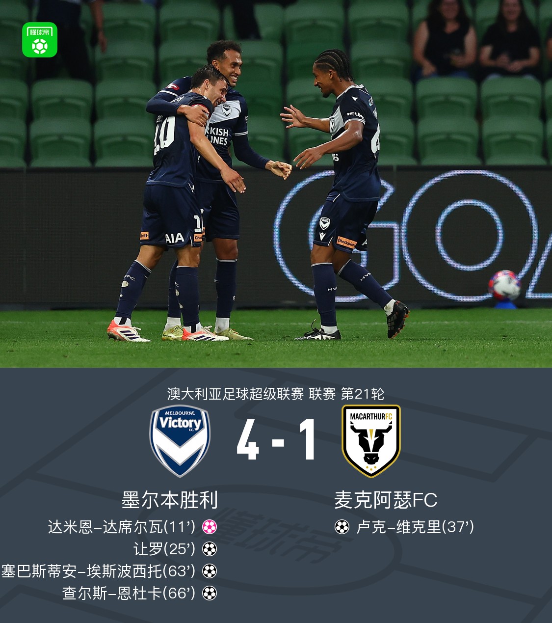 第25分钟,恩杜卡回做,让罗跟上推射破门,墨尔本胜利2-0麦克阿瑟