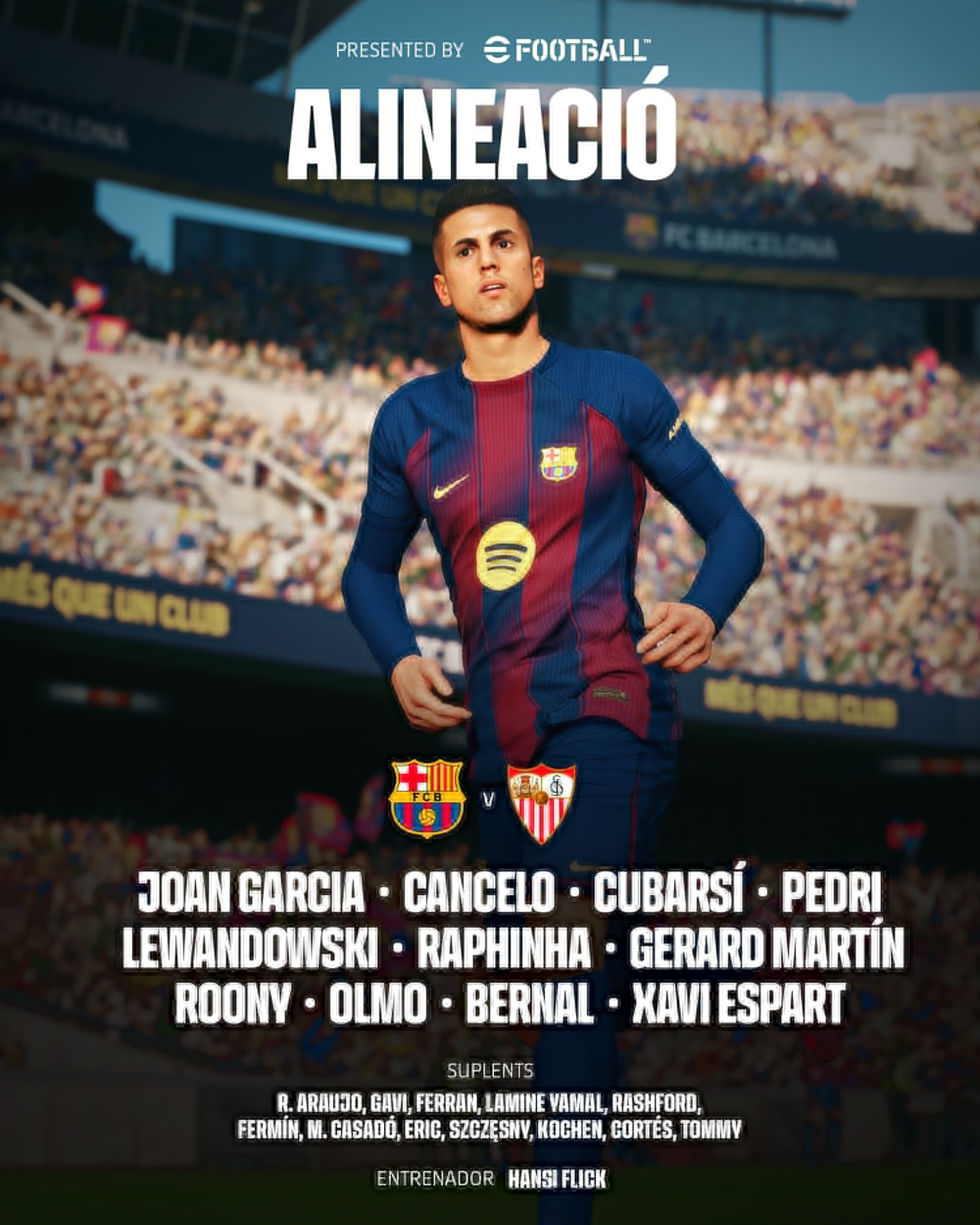 巴萨vs塞维利亚:莱万首发亚马尔替补,18岁小将埃斯帕特出战