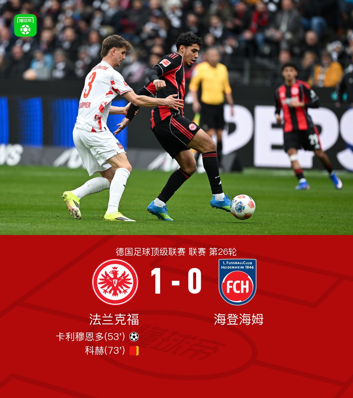 北京时间3月14日德国足球顶级联赛 联赛 第26轮,法兰克福主场对阵海登海姆。法兰克福卡利穆恩多破门。最终比分法兰克福 1–0 海登海姆。