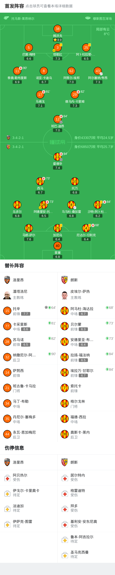 第35分钟,朗斯前场任意球,托万头球攻门顶偏