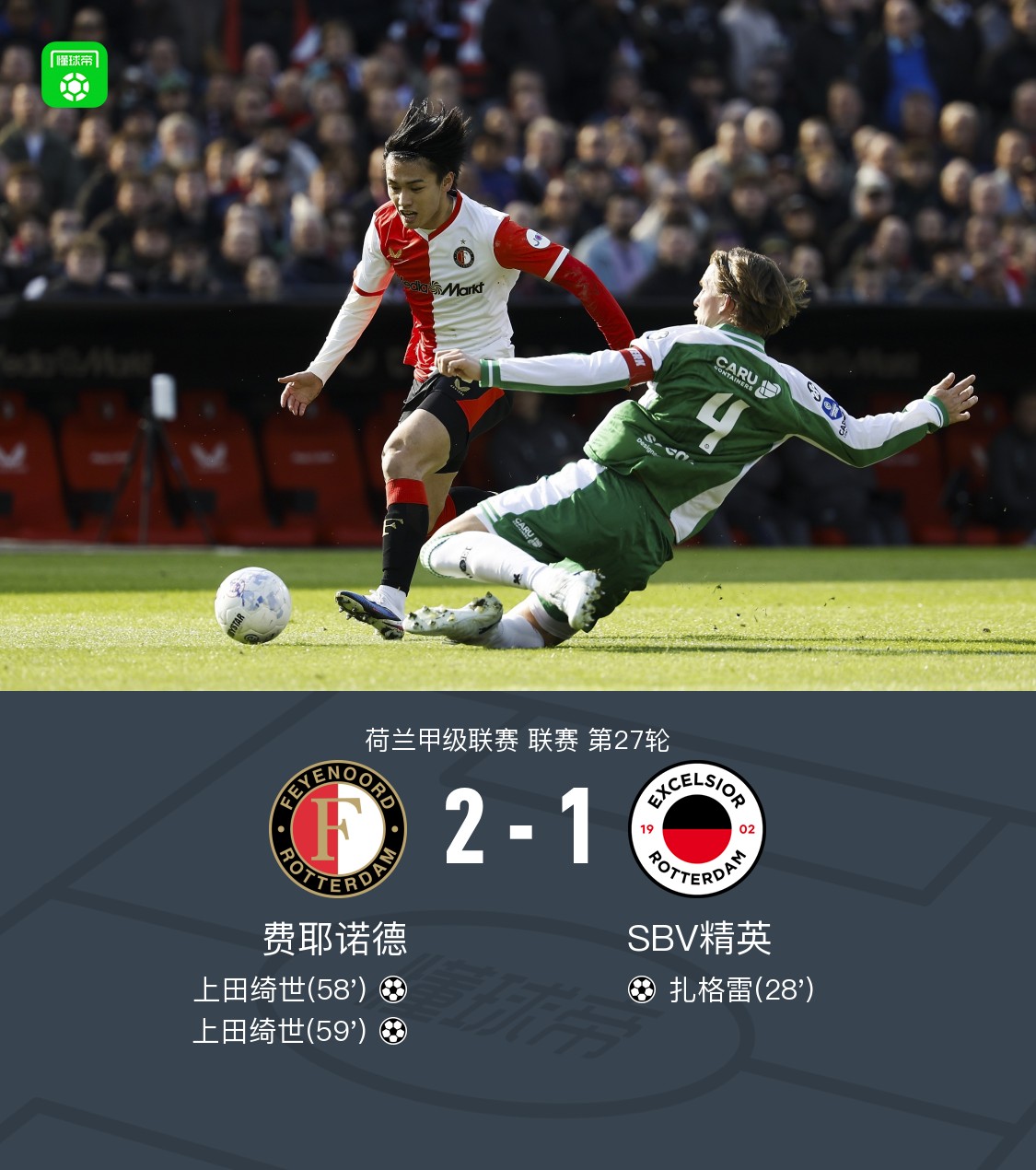 北京时间3月15日荷兰甲级联赛 联赛 第27轮,费耶诺德主场对阵SBV精英。费耶诺德上田绮世梅开二度。SBV精英扎格雷破门。最终比分费耶诺德 2–1 SBV精英。