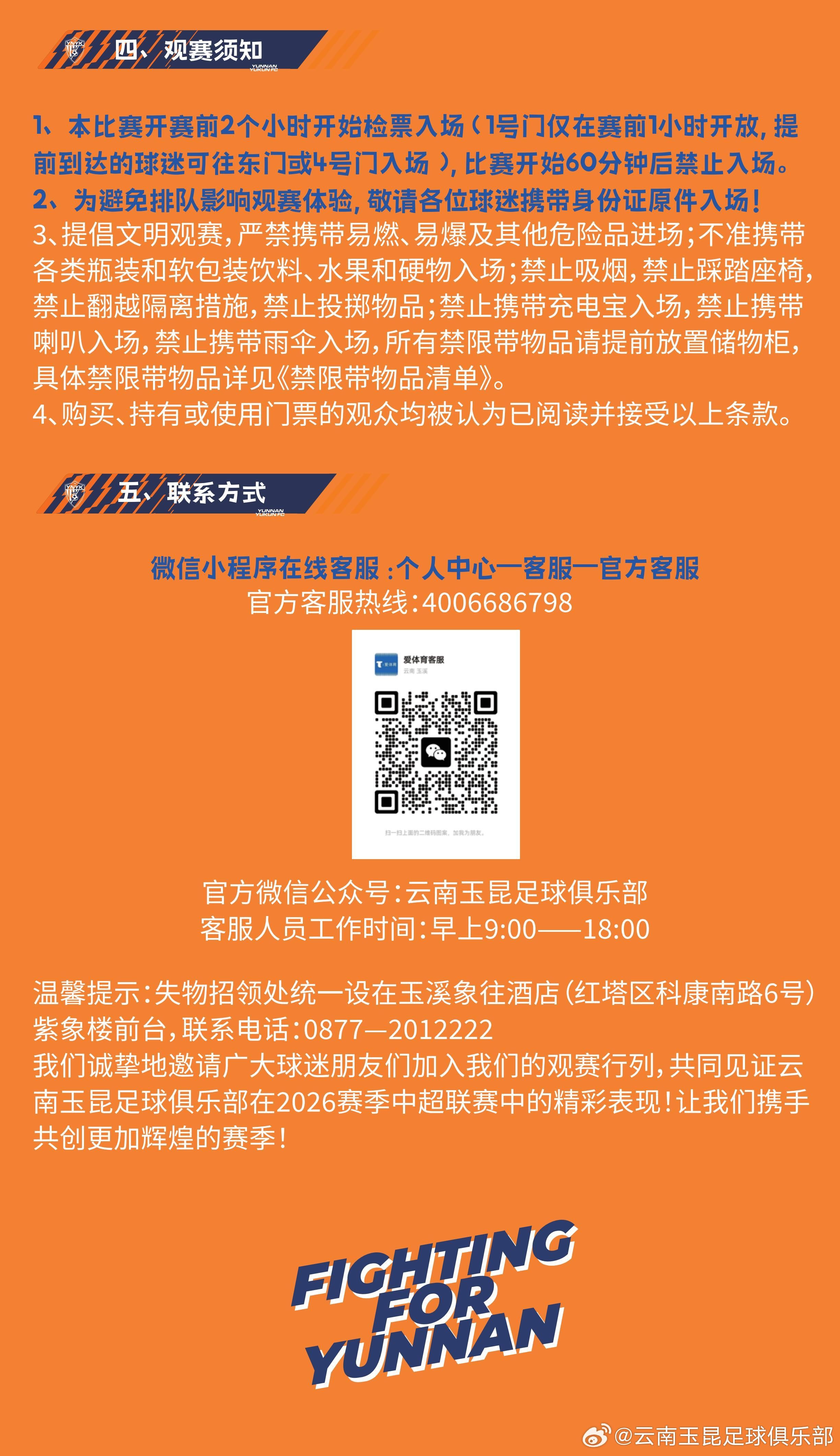 北京时间3月16日,云南玉昆官方公布主场对阵山东泰山的散票公告。